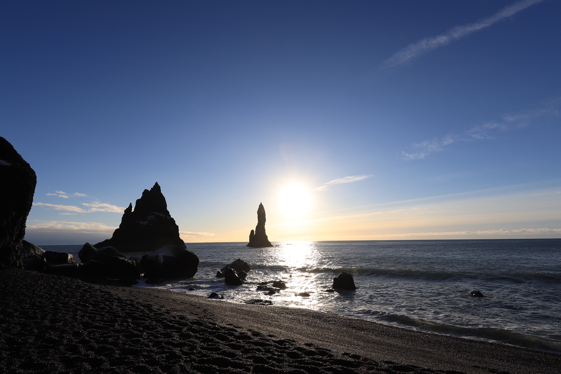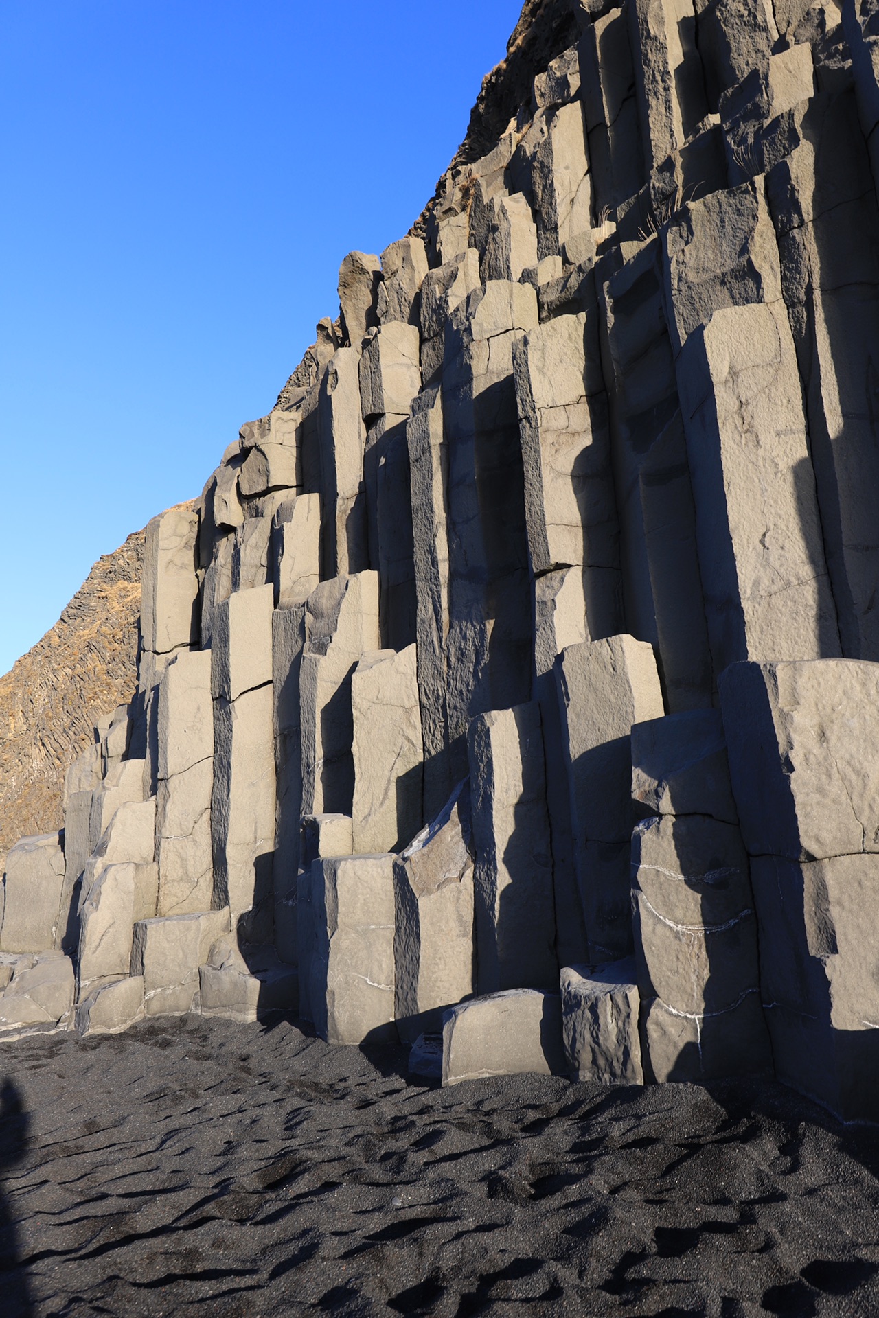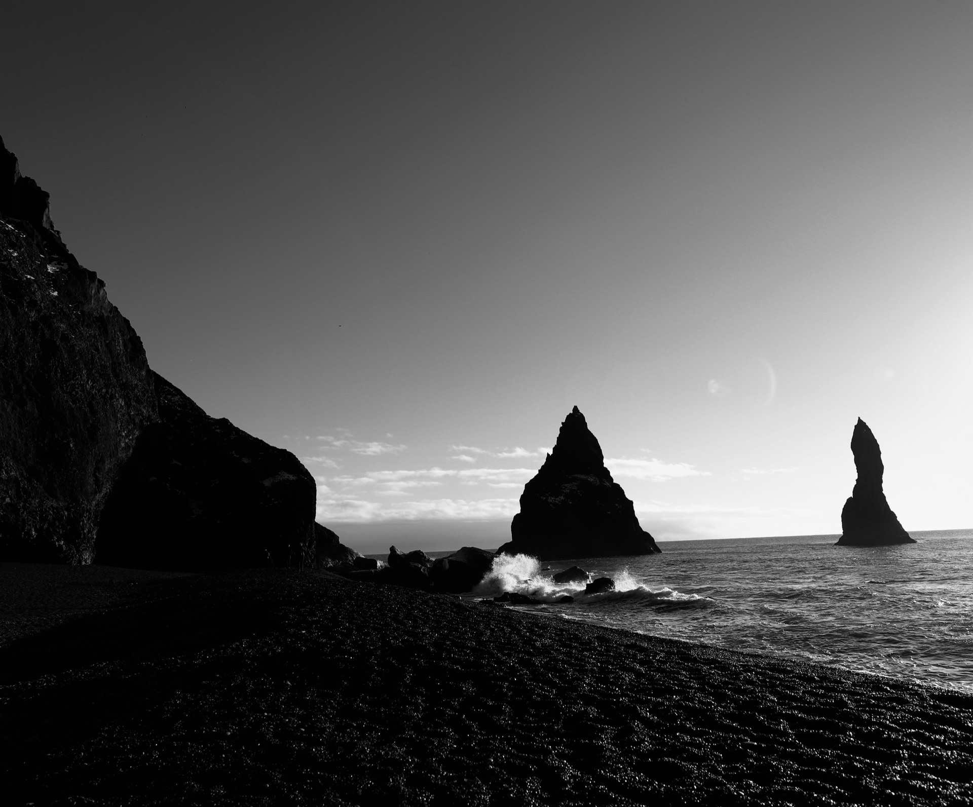 下一站是黑沙滩。我是第一次祈祷阳光不要这么强烈啊。在我心目中,黑沙滩的景色一定是要有那种悲壮的,阴郁的感觉的。天灰蒙蒙的才正正好。奈何那天阳光实在是灿烂啊。当然可能我下午4-5点到的话景象又会大不相同。只好自己拍了张黑白的,来满足一下自己的想象。黑沙滩边的玄武岩柱是网红拍照地,但是我委实没能找到一个没人的契机拍一张照片。倒是有很多路人甲乙丙丁,请问帮他们拍照。可能是看我扛着三脚架,看起来比较专业。