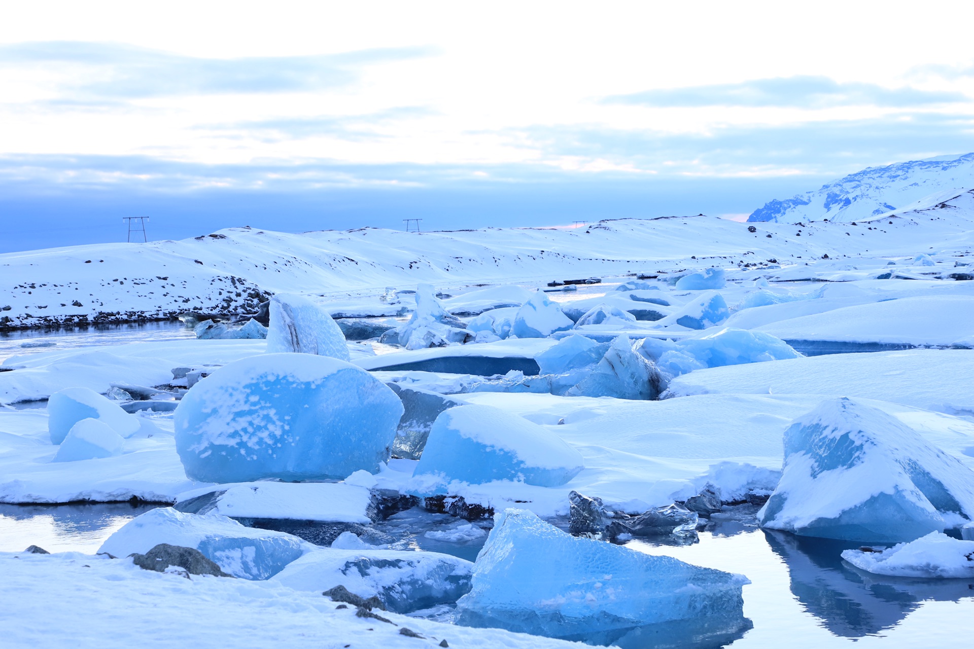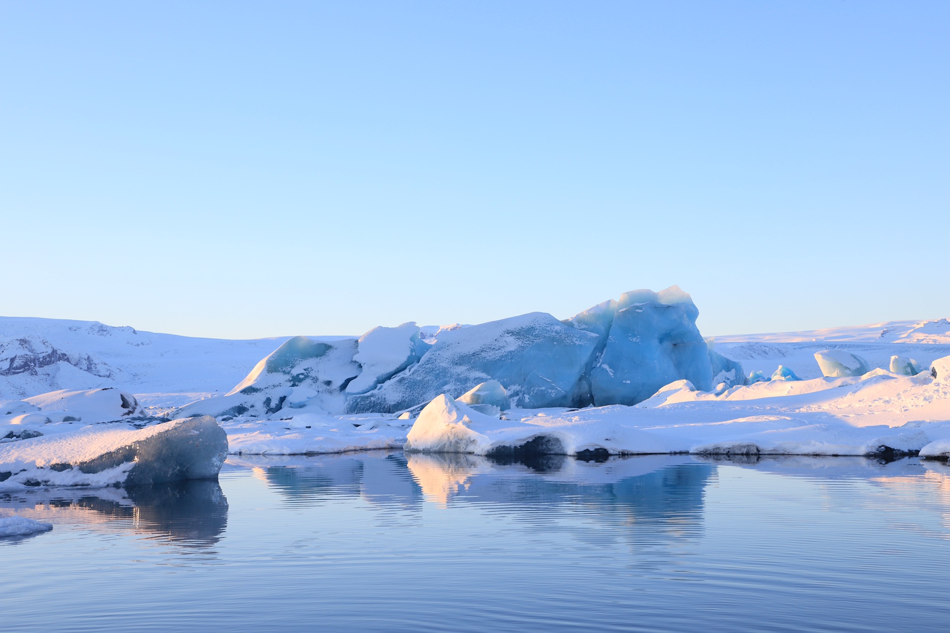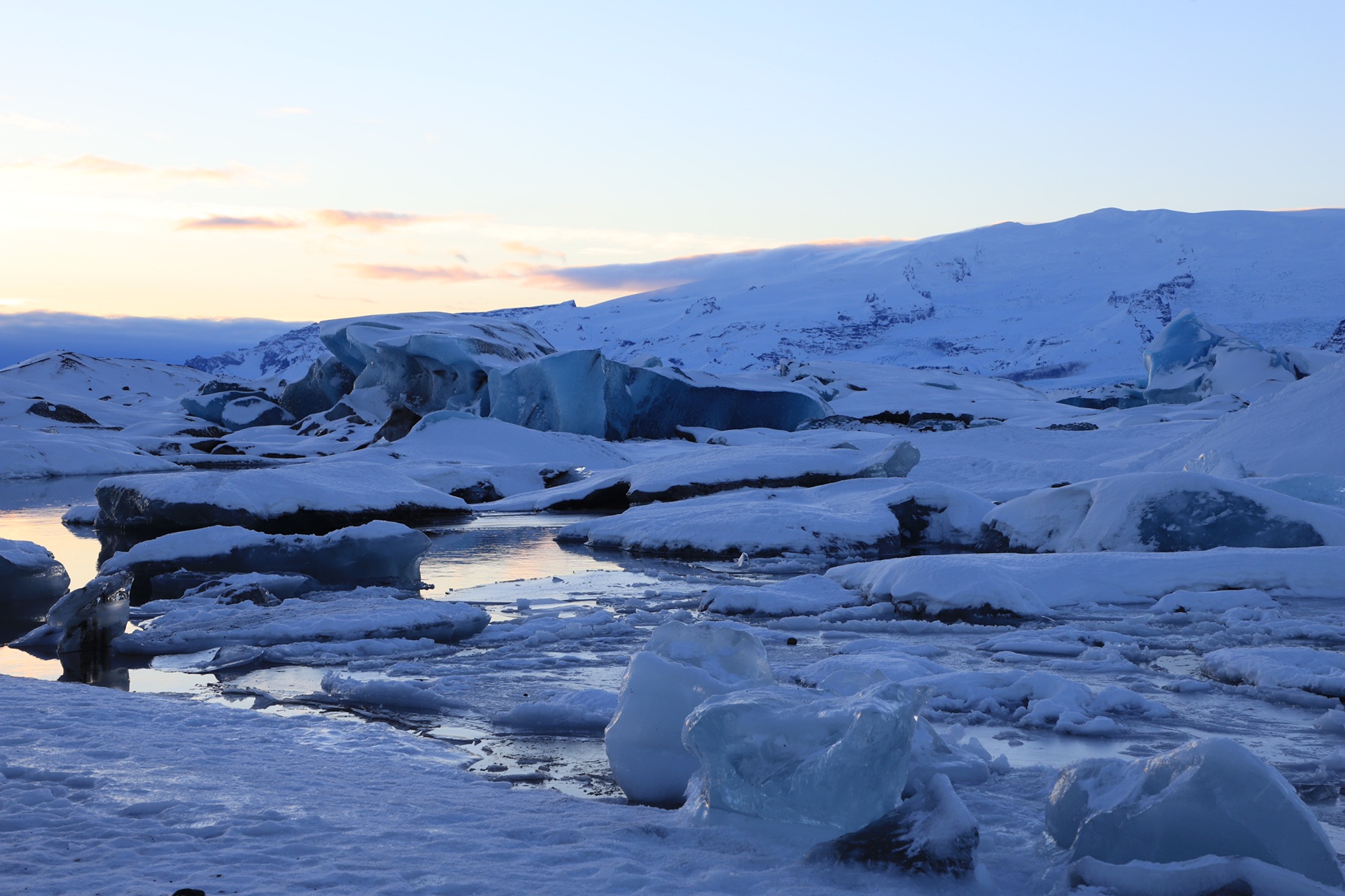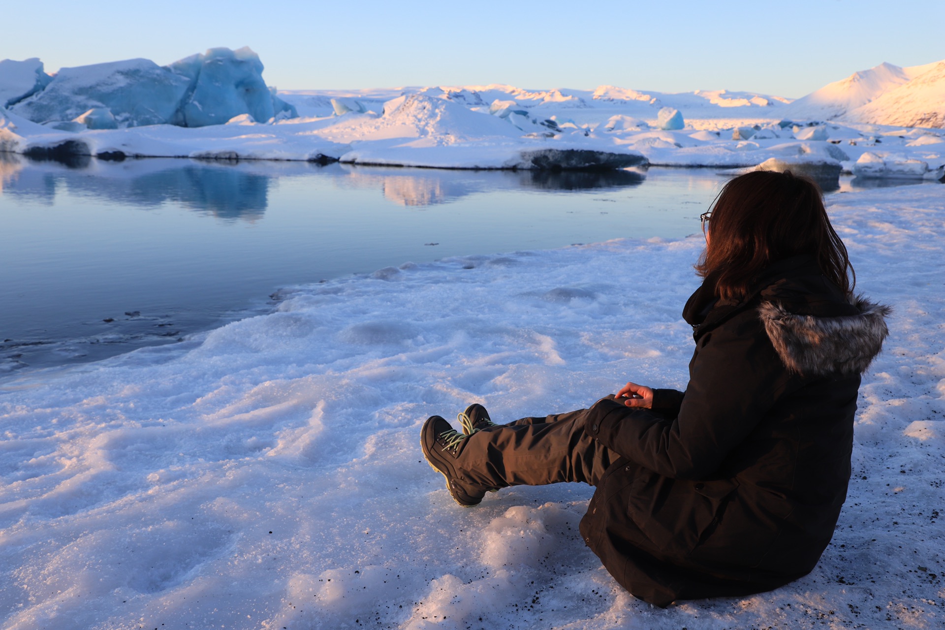 冰河湖我们到的时候,恰逢太阳下山,光线真是柔和得刚刚好。大块大块蓝色的冰漂浮在水面上,甚为壮观。静静坐着雪地上,看着夕阳,看着蓝冰,看着平静的水面,竟感受到了难得的内心平静。