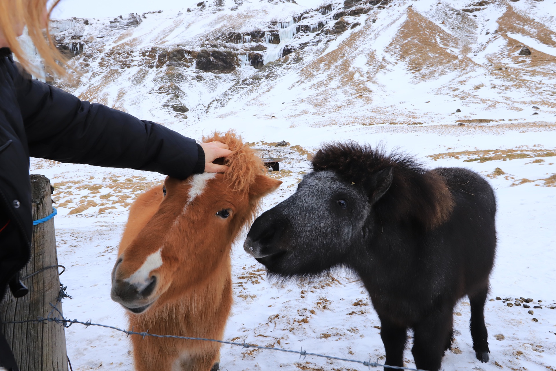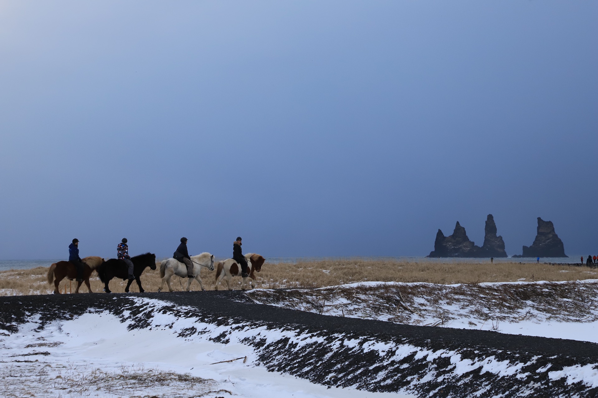 回去的路上,我们遇到了一群冰岛马,还在黑沙滩的另一边休息吃午饭时看到了有人在骑马。不过那天的风和雪实在太大了,只想赶紧安全回到雷克雅未克喝上一碗热汤了。
