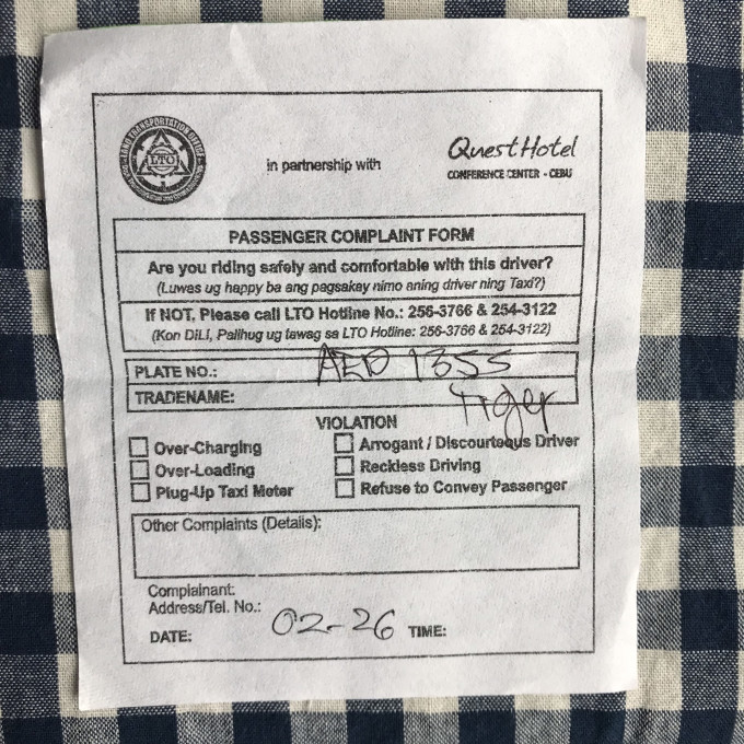 一般来说酒店和机场的出租车比较规矩,因为出发的保安有签发车量信息和投诉单给乘客,就是这个单子。
