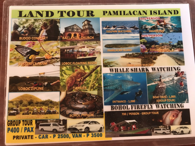 Alona beach包船出海跳岛(看海豚、巴里卡萨或帕米拉坎、教堂岛)3000P每船,一个船最多坐10个人,外加两个船员,如果你们人员特别多,小黑会要求加价的。