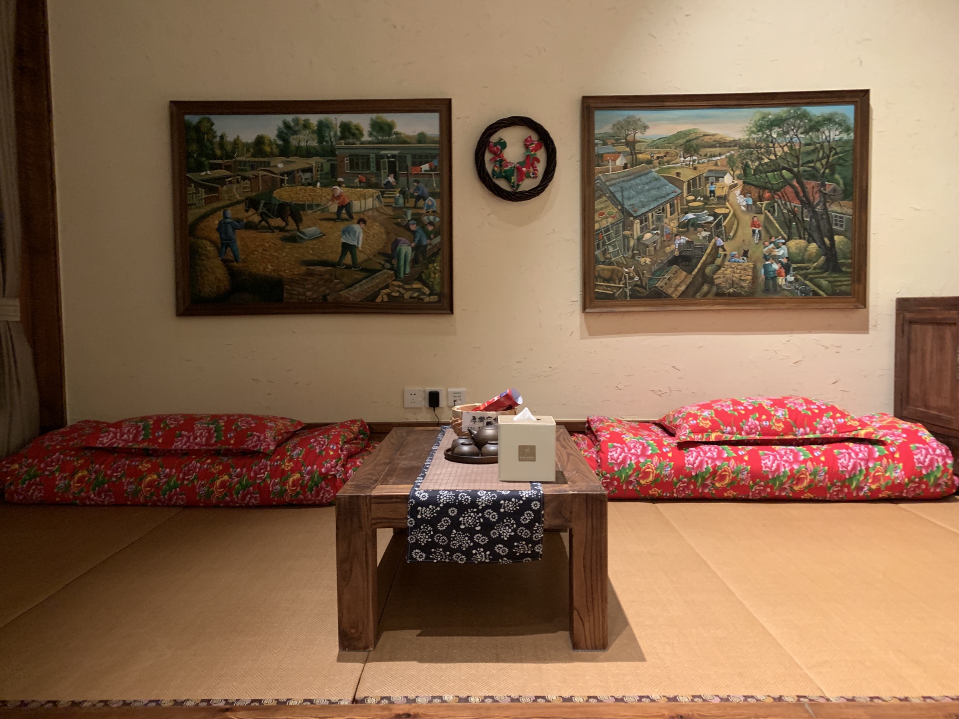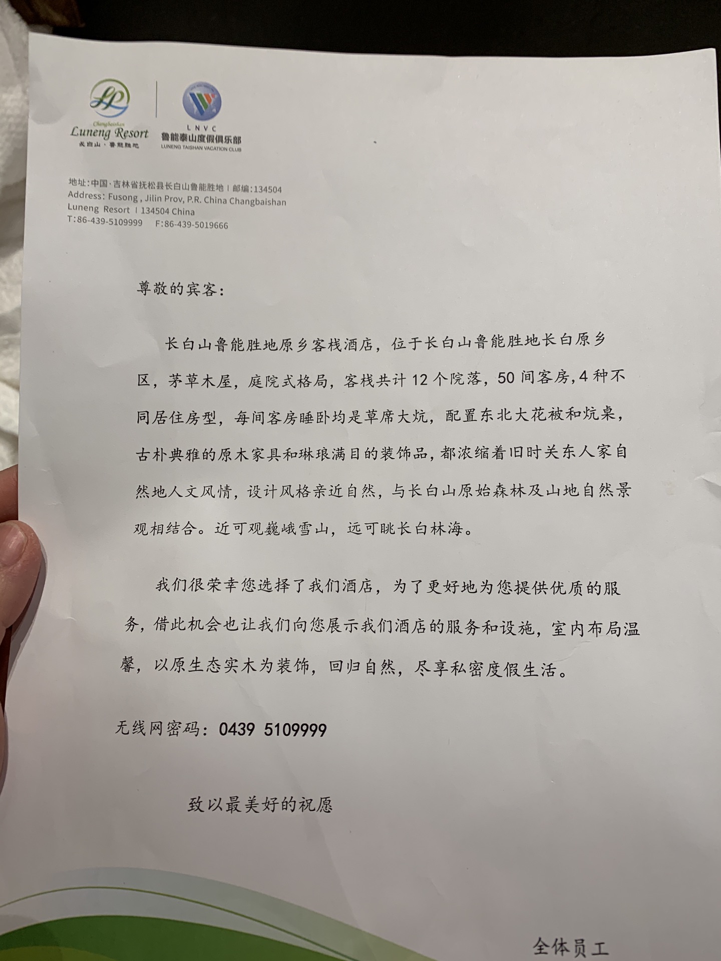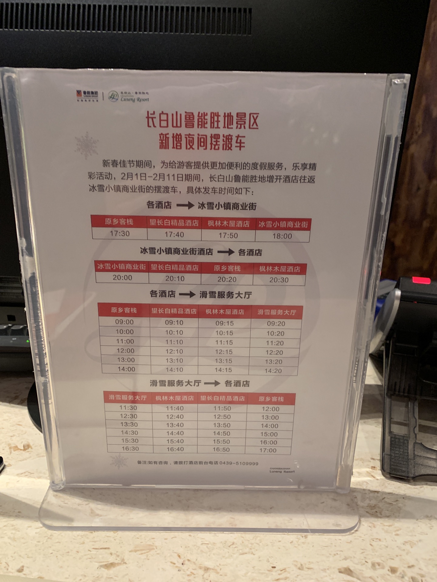 从机场到酒店半个小时,酒店免费接机,和另外一家十几口人一起坐中巴车到酒店,凌晨12点抵达鲁能原乡客栈。办理入住的间隙,服务员小哥把酒店情况大概介绍了下,初一入住的人少,早饭要预定时间,房间已经包含两大一小的滑雪,前台直接办理过了,明天直接凭取票码去滑雪大厅兑换就可以了。