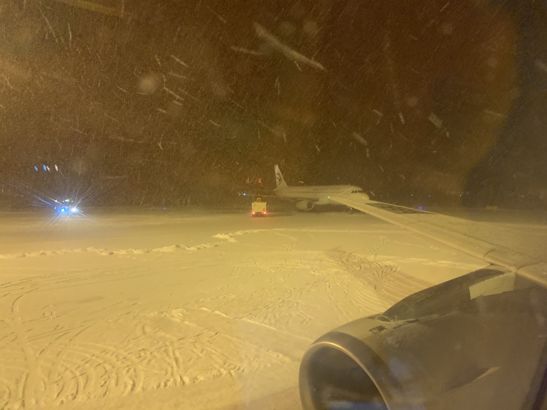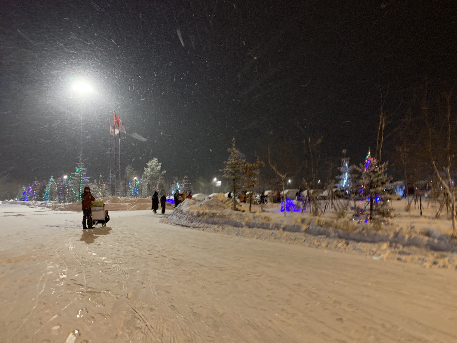 晚上11点才抵达长白山,迎接我们的是漫天飞雪,飞机上的人群都沸腾了。之前还一直担心今年东北是暖冬,没雪可看,其实机场门口就很厚的雪,姐弟俩忙血复活,拿行李的功夫已经迫不及待要去玩雪了,我给他们加了条羽绒裤,弟弟加了件加绒卫衣,我和杭州一样穿法,薄羽绒外套,落地时预报零下13度,只是刚踏出机场有点凉,玩雪时完全感觉不到冷,就是手倒是挺冰,手套一定要带好。