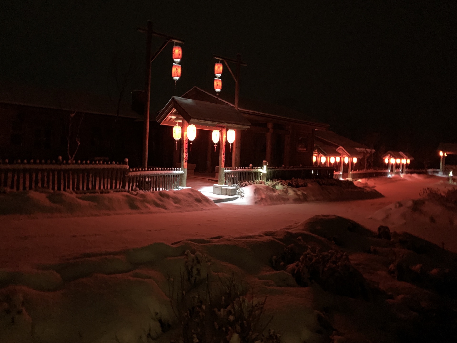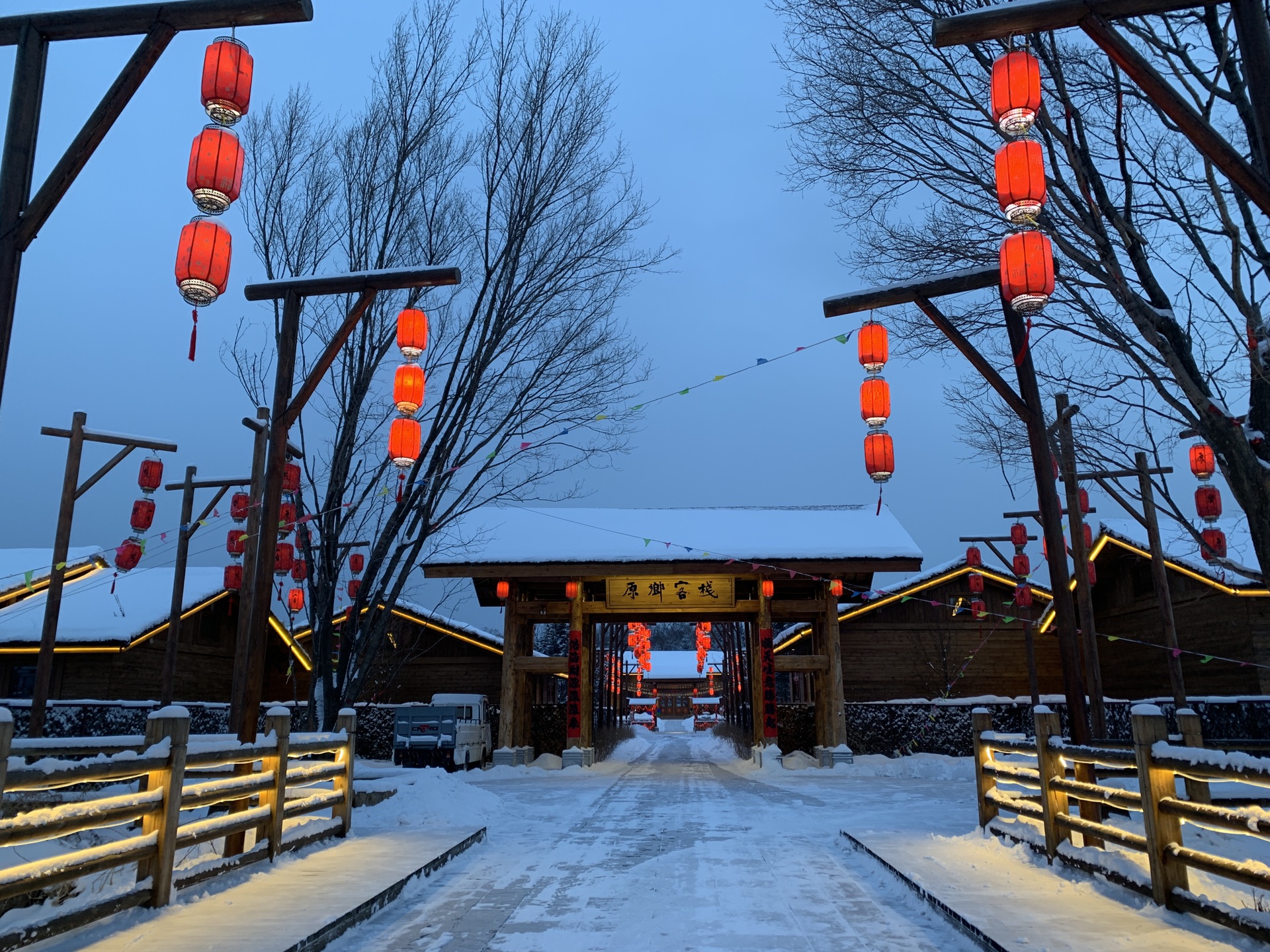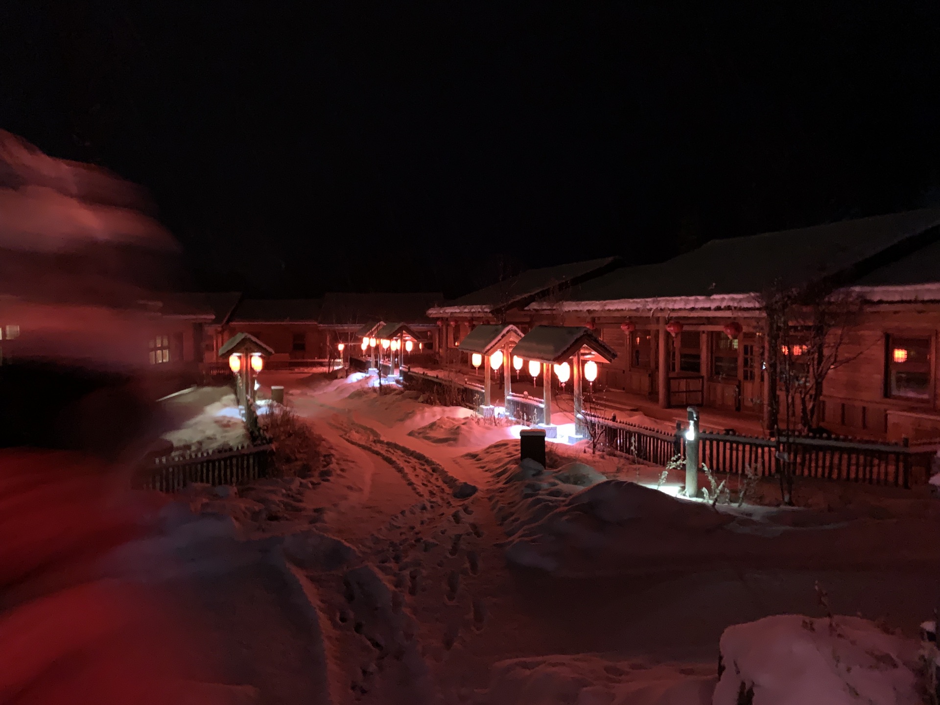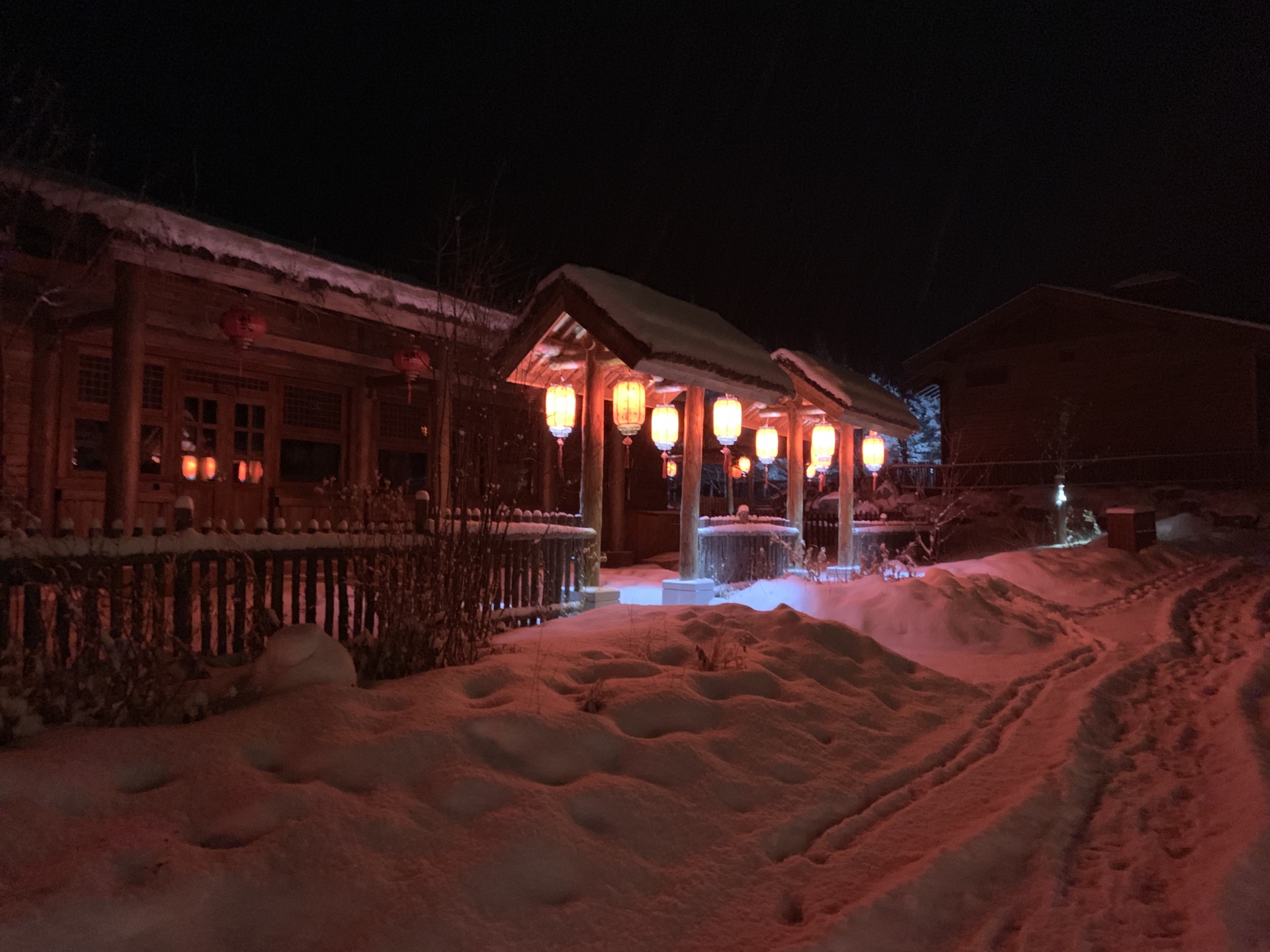 从滑雪大厅出来,酒店班车准时来接我们了。17点左右回到原乡客栈,小宝一下车又开始要玩雪,酒店门口就是一整片积雪,应该是停车场之类的,桥下面也是厚厚的积雪,小宝还一定要往桥下面走,后来看地图才发现其实那就是河。本来晚饭冲着客栈餐厅有二人转表演,后来得知二人转表演春节期间都到商业街的商铺里了,不过也懒得折腾,还是直接在客栈解决了。晚上的客人明显多了,整个度假村显得热闹起来,大红灯笼高高挂起,很有节日的气氛。