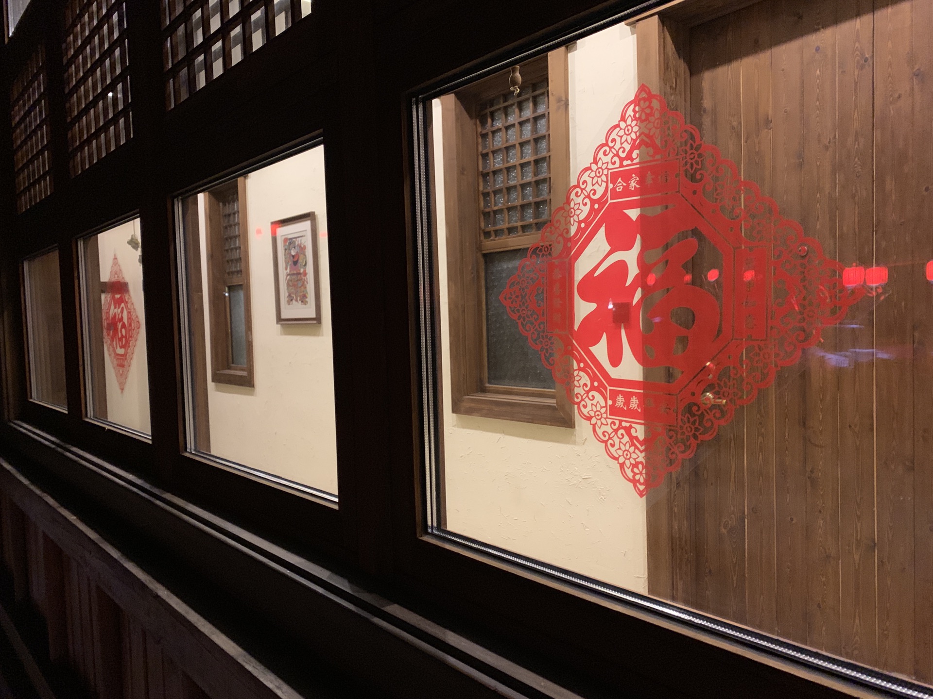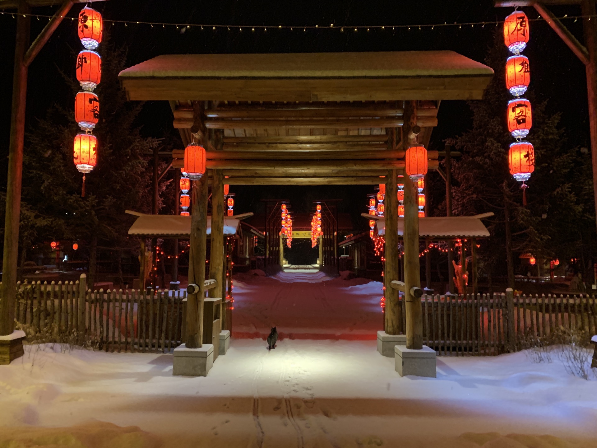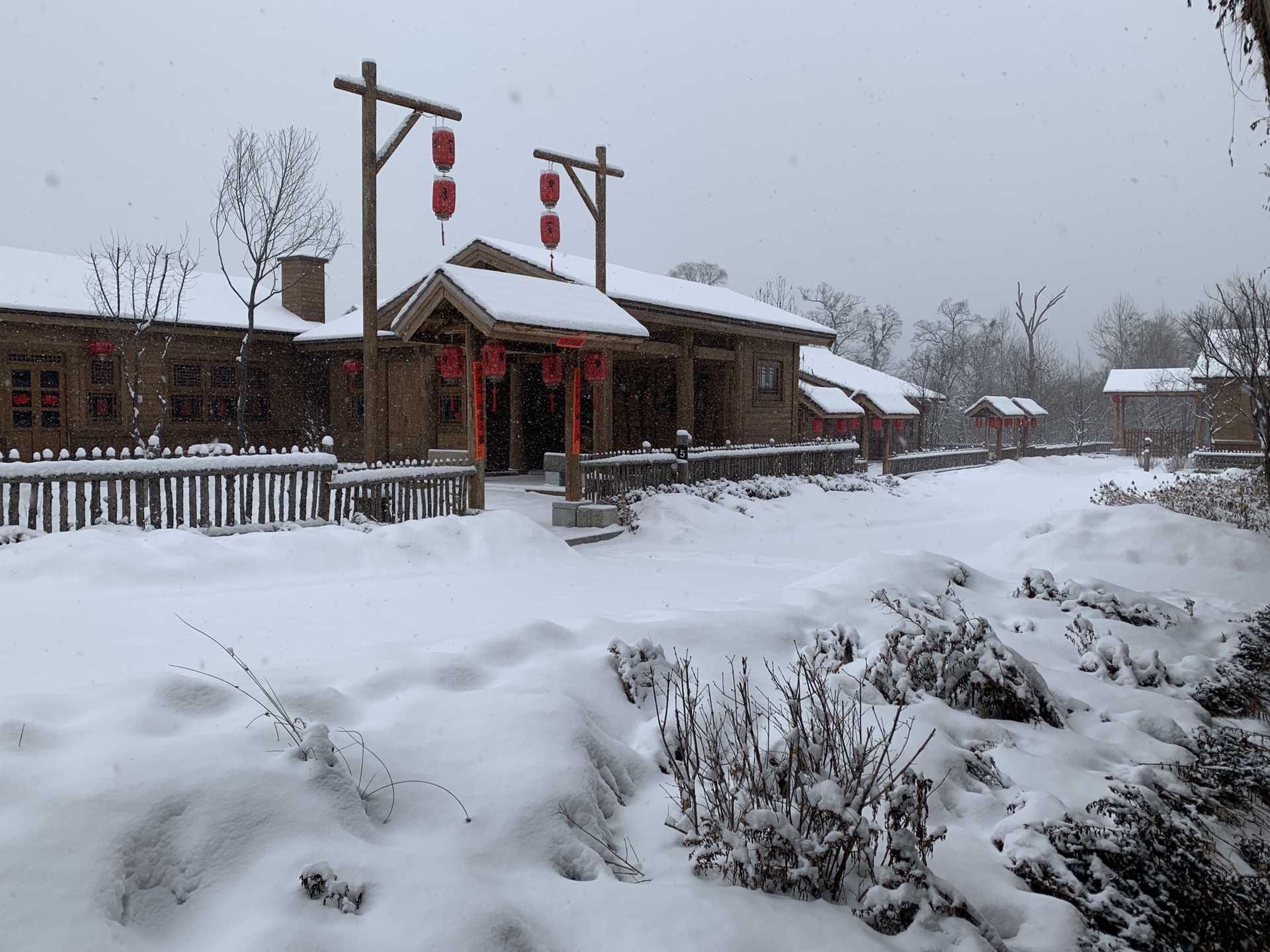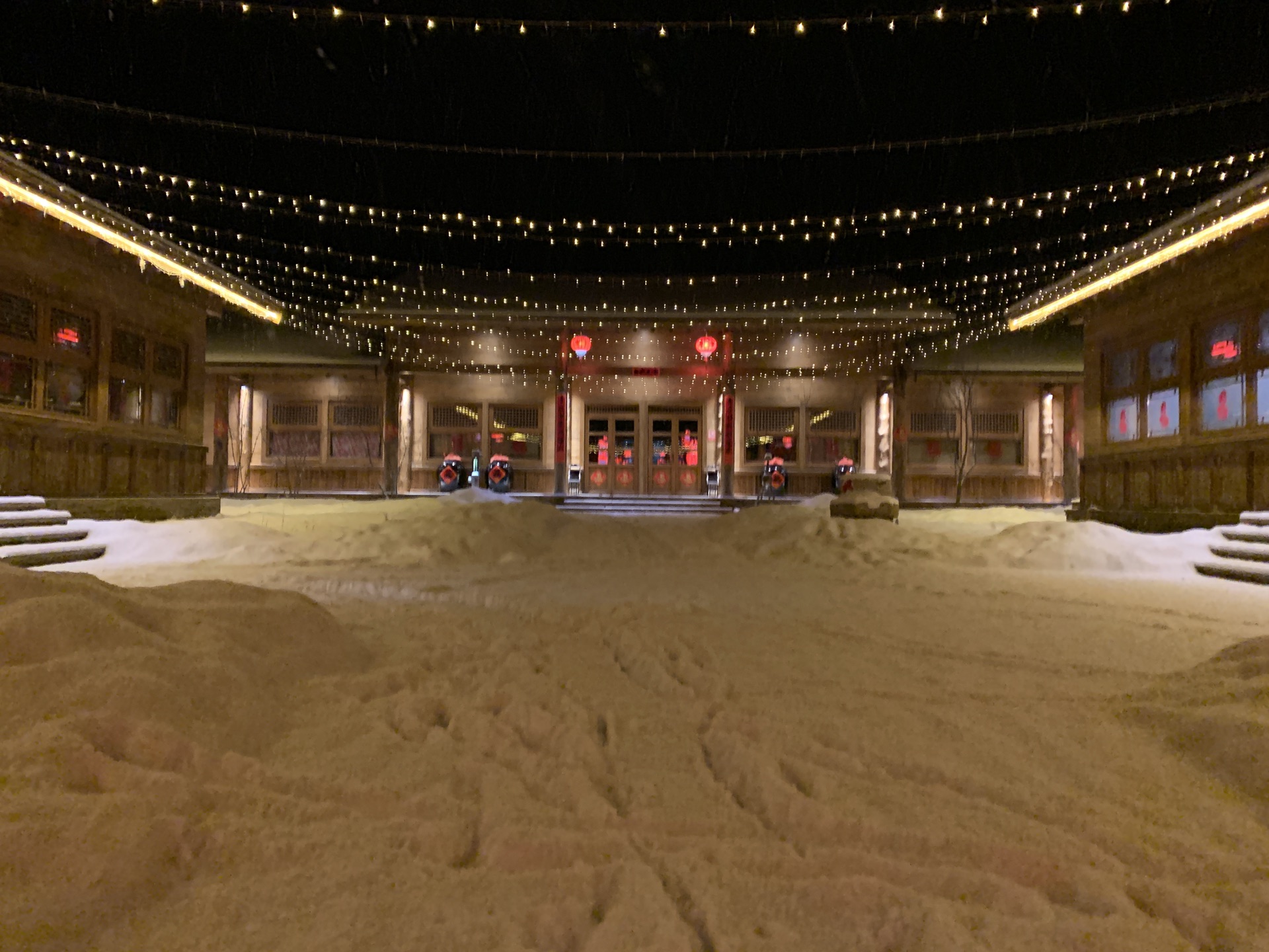 从滑雪大厅出来,酒店班车准时来接我们了。17点左右回到原乡客栈,小宝一下车又开始要玩雪,酒店门口就是一整片积雪,应该是停车场之类的,桥下面也是厚厚的积雪,小宝还一定要往桥下面走,后来看地图才发现其实那就是河。本来晚饭冲着客栈餐厅有二人转表演,后来得知二人转表演春节期间都到商业街的商铺里了,不过也懒得折腾,还是直接在客栈解决了。晚上的客人明显多了,整个度假村显得热闹起来,大红灯笼高高挂起,很有节日的气氛。