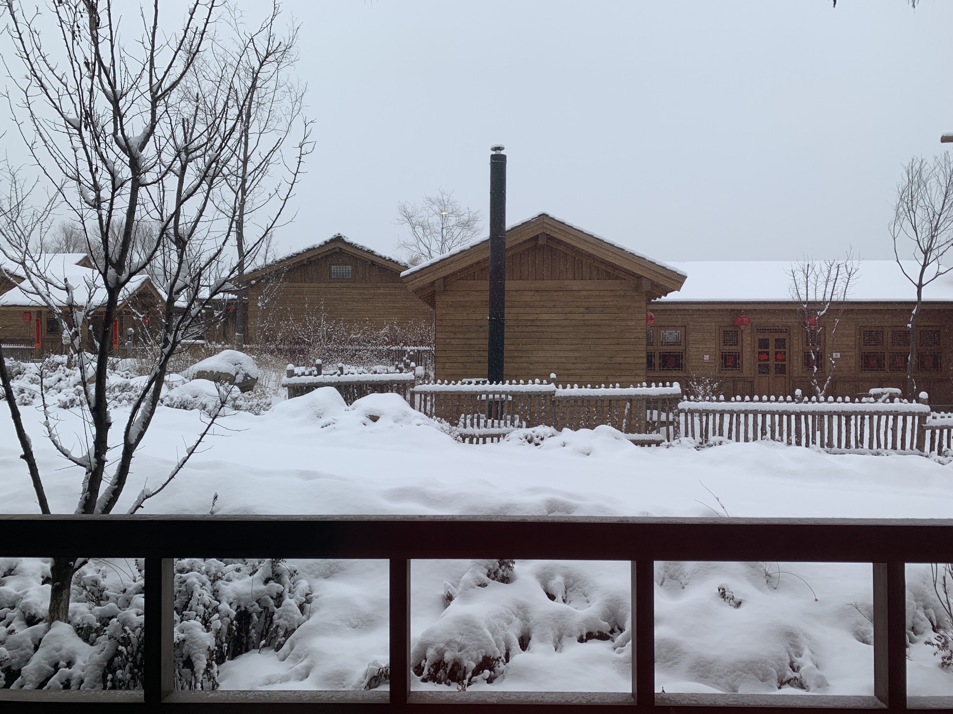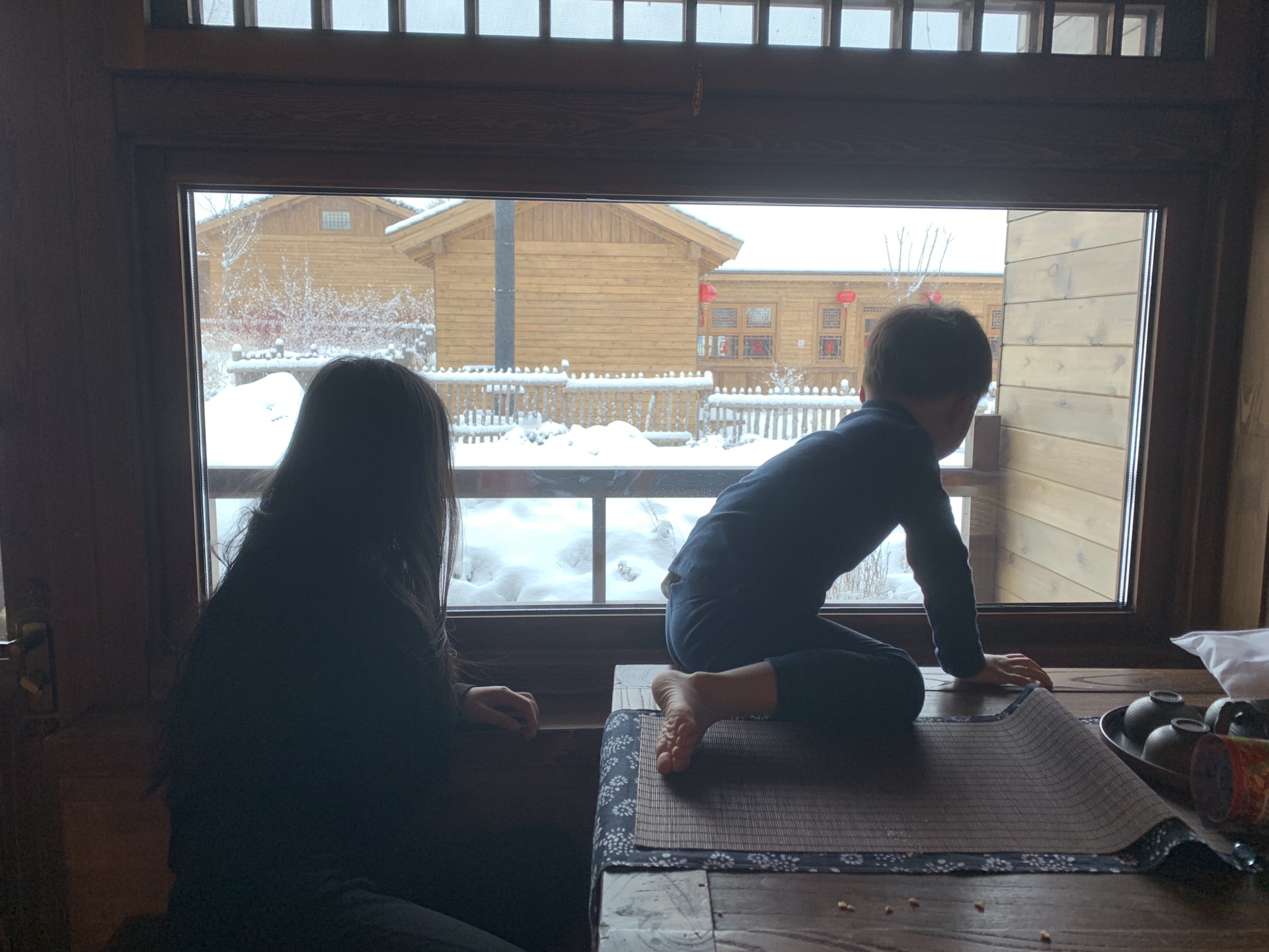 从房间到餐厅,短短几分钟的路程,孩子们愣是走了半个小时,还是在我们千呼万唤下才肯进餐厅吃早饭。早餐预定的时间是九点,因为客人少,单独给我们做的,整个圆桌被摆放得满满的,而且都是孩子们爱吃的食物,那天的早餐是我整个旅行中吃得最舒服的一顿。服务员是一个穿花棉袄的东北帅小伙,态度不错挺能聊的,和他的聊天中得知今年确实是暖冬,我们来之前已经很久没下雪了,我们很幸运的赶上了这场大雪。
