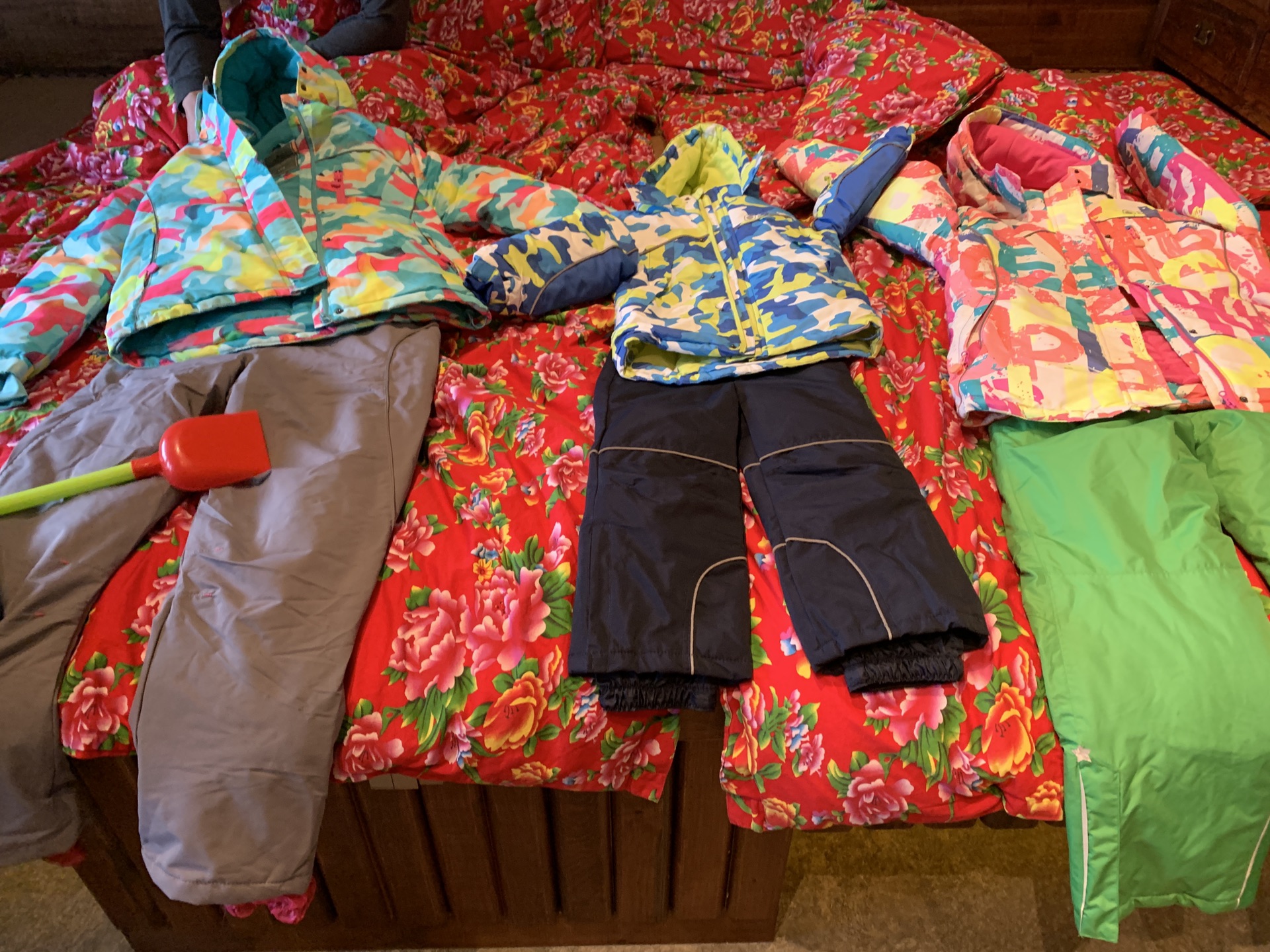 4、小宝4岁,滑雪时上身穿迪卡侬保暖透气速干内衣、中领羊绒衫、优衣库绒面外套、滑雪服,下身穿内衣、加绒裤、滑雪裤,脚上穿滑雪袜子。去老里克湖和天池时,上下加了一套丝棉服,把滑雪服里面那件绒衣换成薄款羽绒服,袜子套了两双滑雪袜。大宝和我们一样穿法,滑雪时上身优衣库发热内衣、中领羊绒衫、滑雪服,下面发热裤子、滑雪裤。去老里克湖好和天池时,内衣换成了加厚的保暖内衣,毛衣外面加了件GAP加绒加厚卫衣,下面把打底裤换成优衣库加绒加厚保暖打底裤。我们去老里克湖时脚是真冷,刚开始让大宝穿两双滑雪袜,他嫌厚不愿穿,后来冻得不行,向我讨袜子穿。