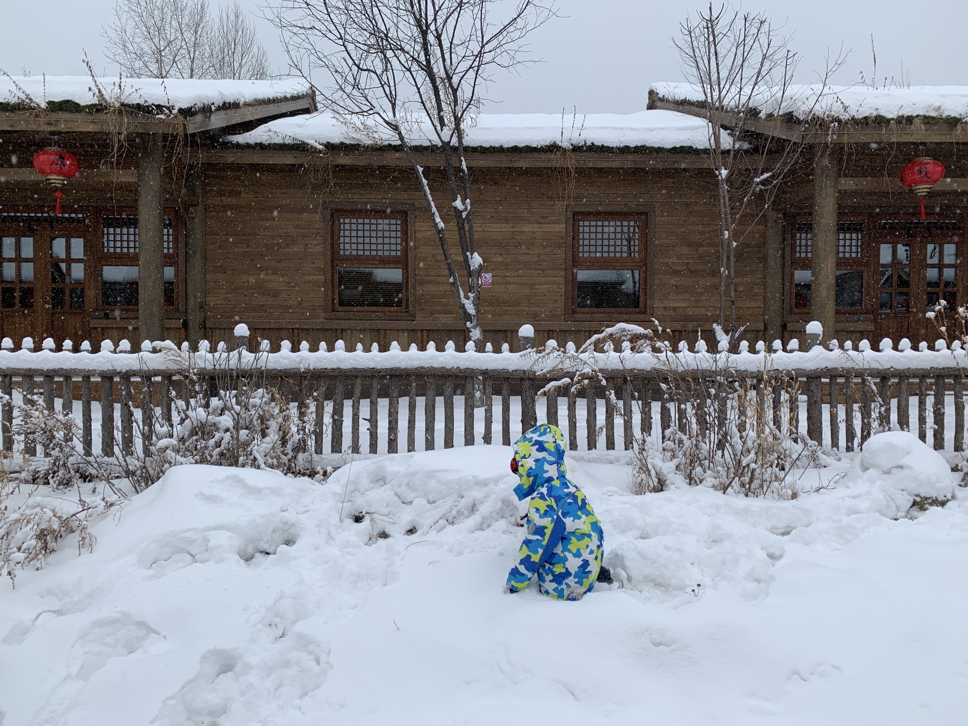 推门而出,完全被眼前的雪景给迷住了,这不就是我心中的雪乡吗,屋顶栏杆花园都积起了厚厚的白雪,看到地上洁白无瑕的雪实在舍不得破坏,可是孩子完全顾不了这么多,早就投入到雪的怀抱中了,深一脚浅一脚在积雪中前行,发出咯吱咯吱的响声,一不小心就摔在了雪堆里,孩子们索性就和雪地来个亲密接触,欢快的笑声不时在耳边响起。