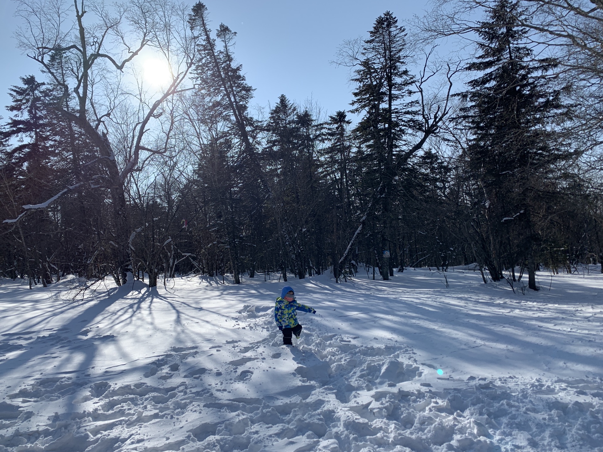 这时候雪已经不下了,天空开始放晴,我硬着头皮陪大宝上魔毯,站在山顶感觉咋那么高呢,完全没勇气滑下来,摔了一跤后愣是抱着雪具走了下来。大宝在边上看着也是极其无奈,只能自己先滑下去等我。就这样折腾一番后,关门时间快到了,还了雪具雪鞋回大厅找小宝,正好他也醒来了,吵着要去做雪地摩托,可是嬉雪乐园也马上停止营业了,只能等明天再来坐了。