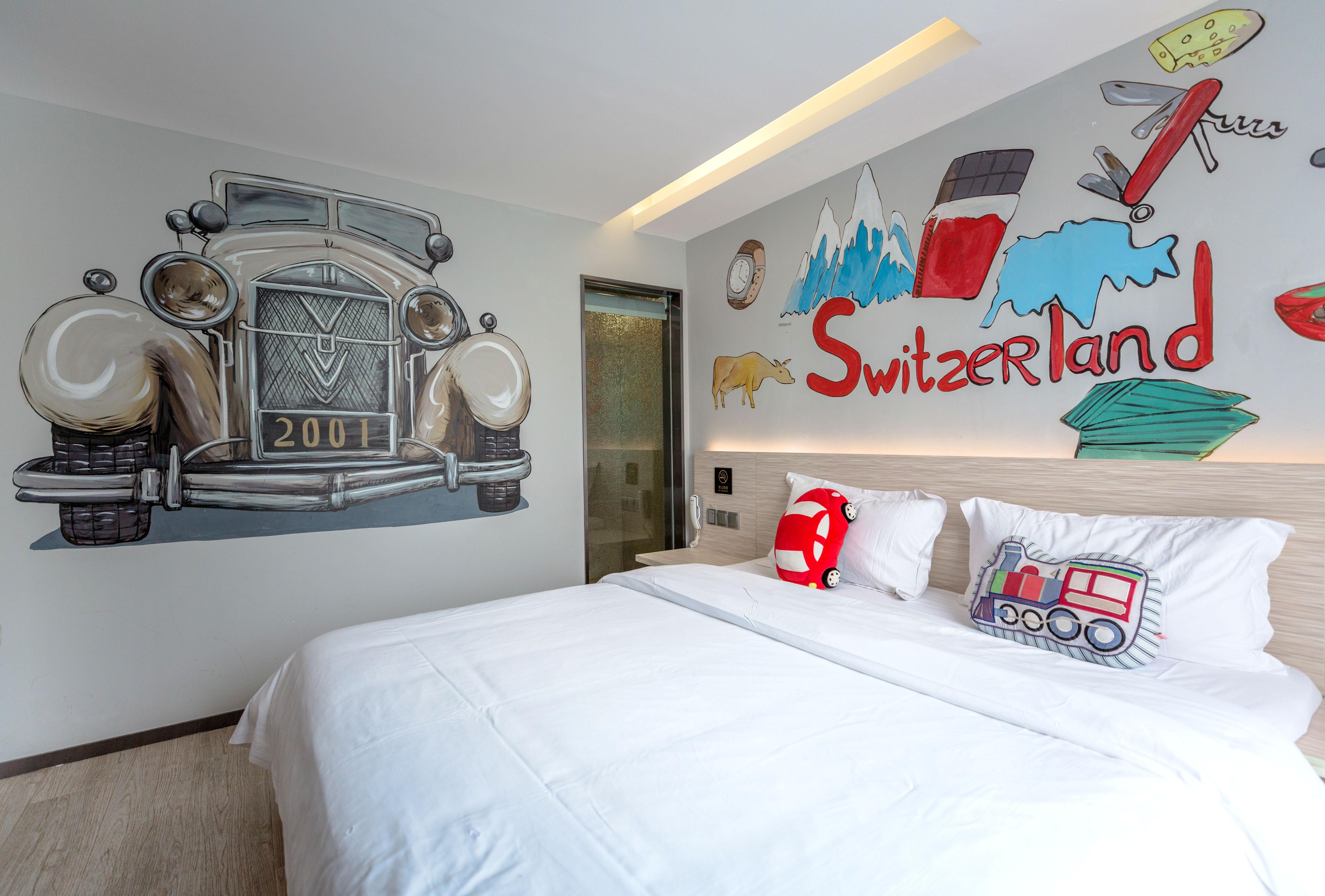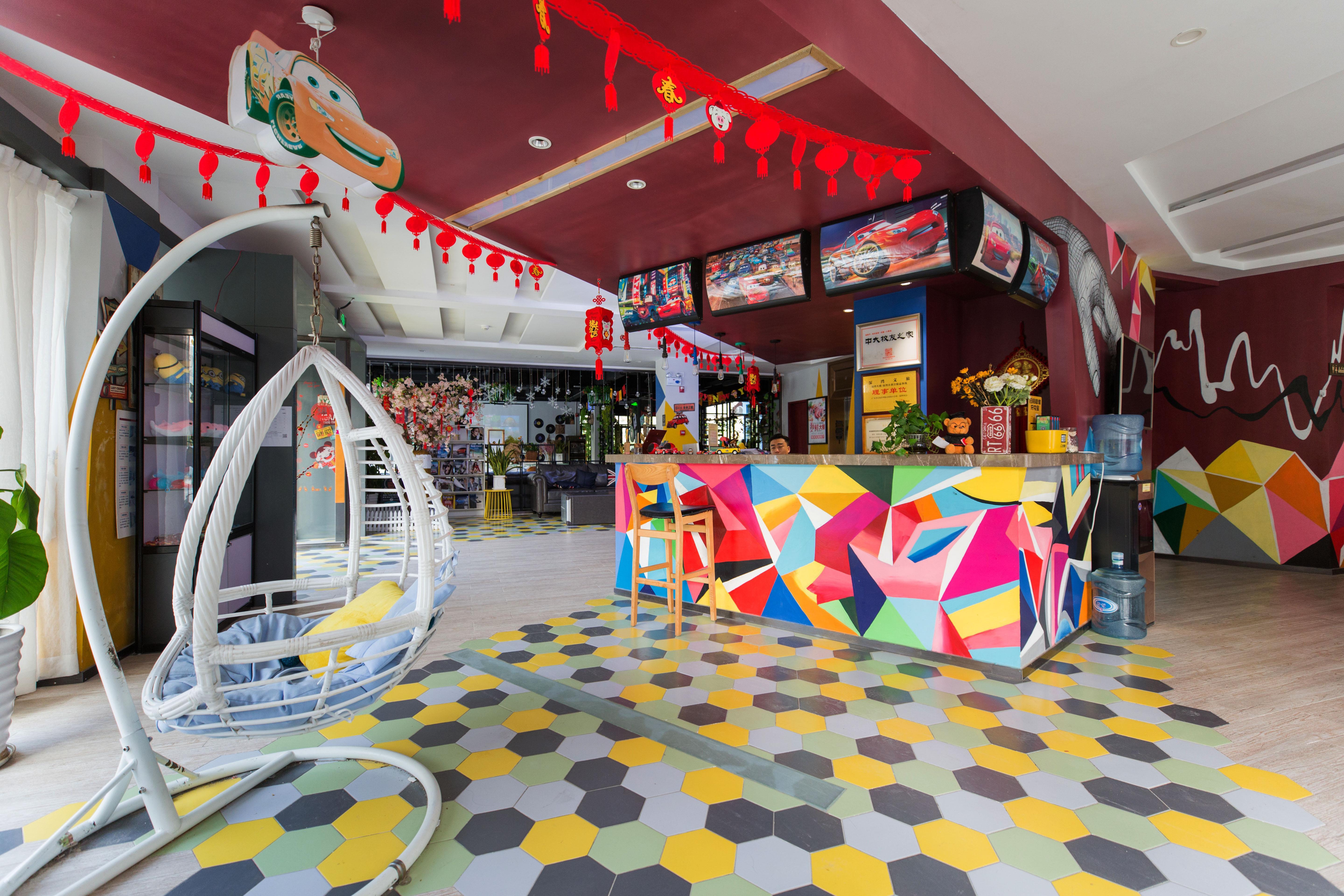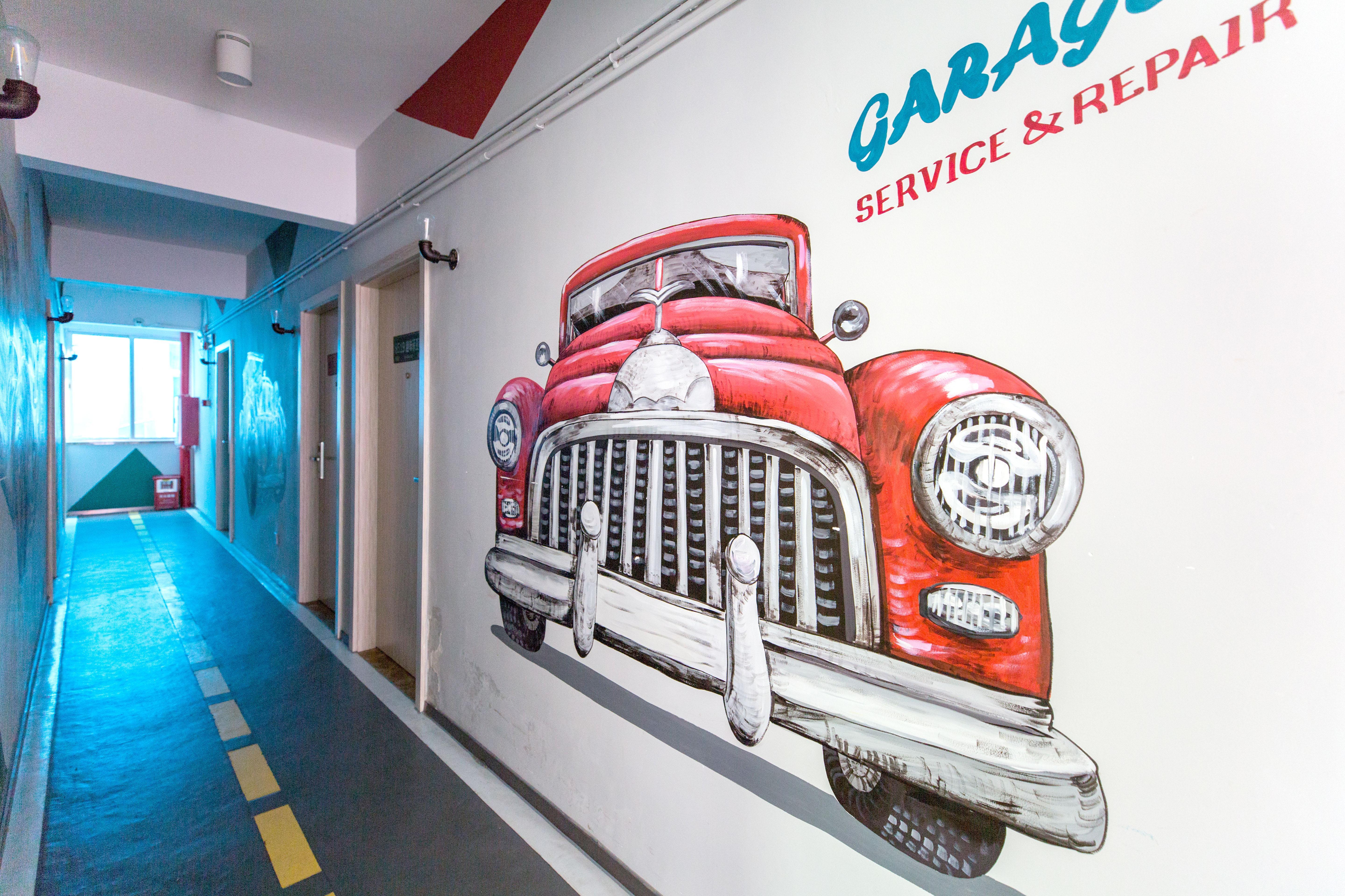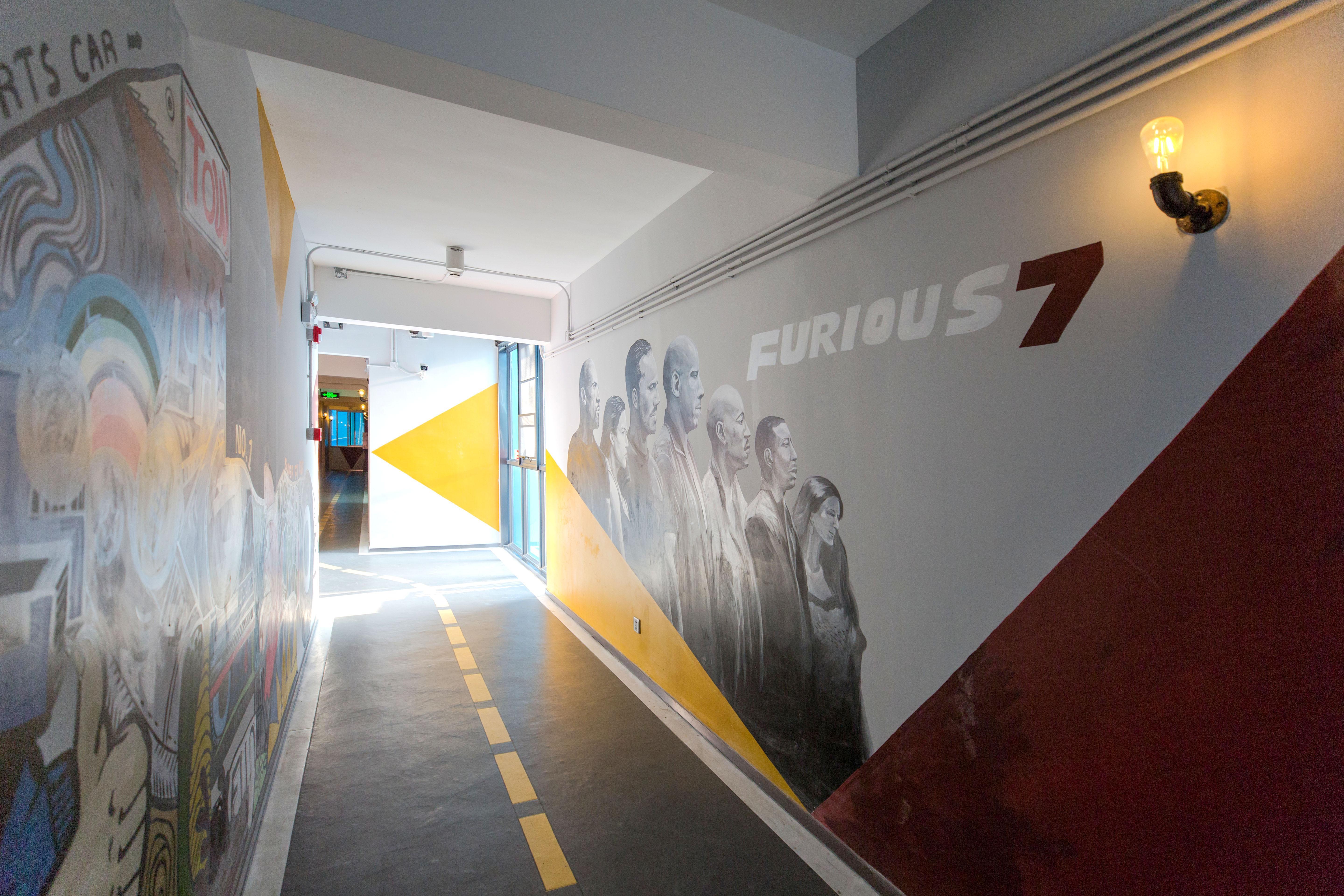 以车位主题的客栈,自然会有许多关于车的元素。从走廊到房间无不充斥着关于车的演绎,激情与速度系列人物画像更是一代人的记忆,回荡的马达声还在耳边响起。每一幅图画都与建筑环境密切相关,把整个居住空间都妆点的凌厉精致。