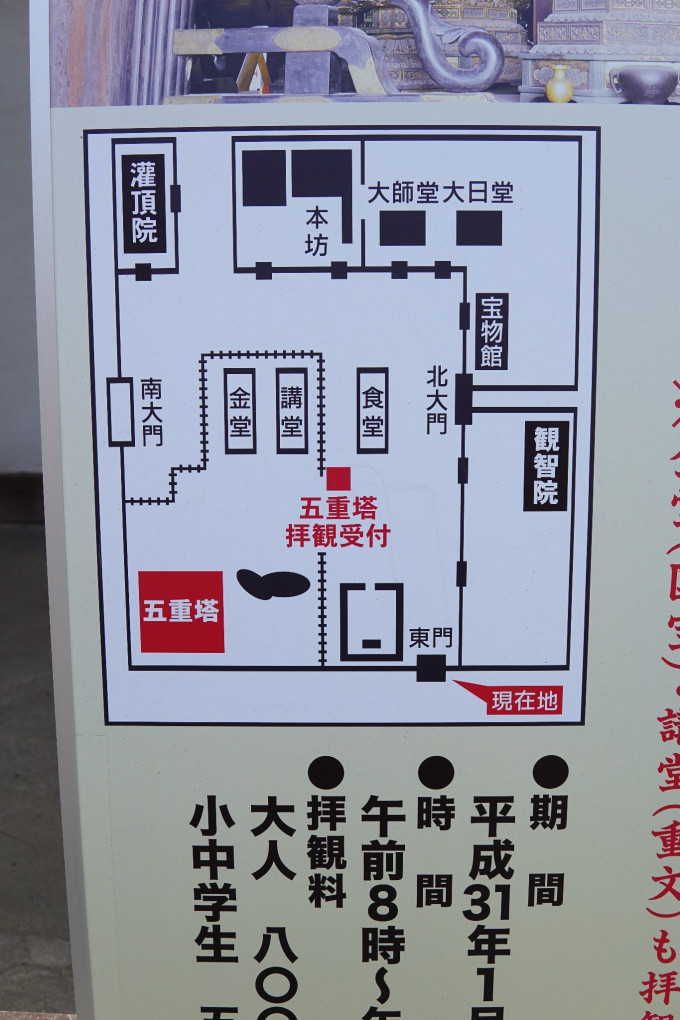 下午第一个目标是东寺。东寺离京都站非常近。基本步行就可以到达。东寺之所以要来,就是因为之前提到的。东密初祖——空海大师(弘法大师)。原本空海大师从中国回国以后,也是将寺建在了高野山金刚峰。也就是关西机场再往南的方向。但是那个地方实在是过分的偏僻了。可能空海也这么觉得。所以他后来响应天皇的号召,将寺建在了京都,原本京都有东寺,自然也有西寺。但西寺后来被火焚毁。现在留下的就只有东寺了。其实东寺也经历了火灾。但是因为名气够大,所以不管烧多少次,都不愁重建的钱。如果只说东寺,你不能理解他在日本佛教界和京都的地位,那么他其实还有另外一个名字——教王护国寺。