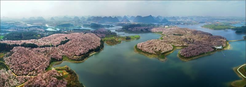 妖娆烂漫,这些粉嫩欲滴的精灵娇俏地立在枝头,或正或侧、或仰或俯,交相辉映,争相斗艳,如临水梳妆的美人。每年三、四月份贵州省贵安新区万亩连片70多万株的樱花绽放,粉红色的花瓣连成花海。这种浪漫,我想与你分享。