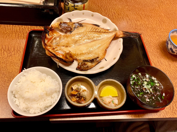 两个人点了两份套餐,用的是河津有名的金吉鱼,做法一个类似红烧,一个就说烤的;都是套餐。2400日元一套,味道还是不错的。