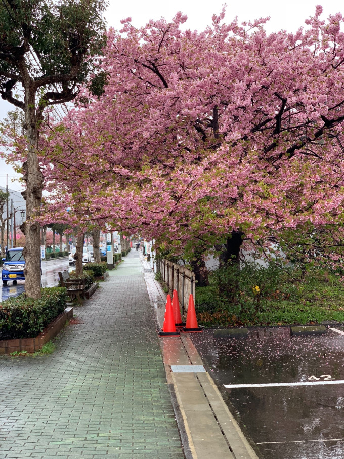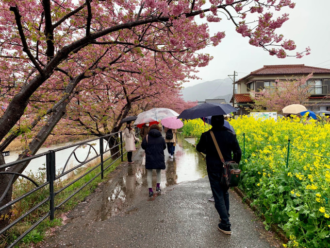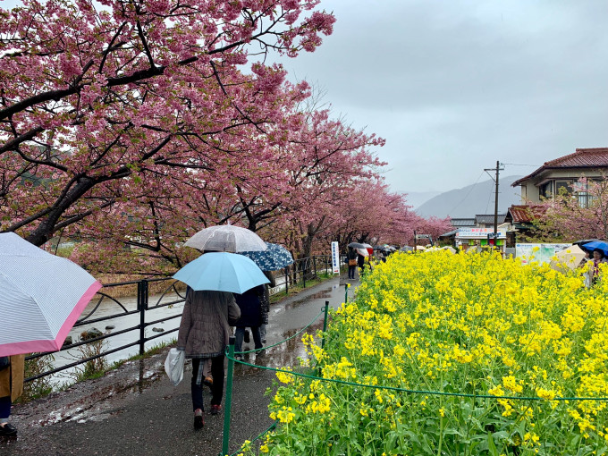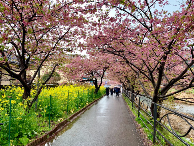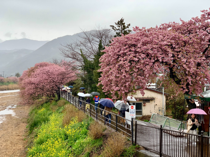 今年的河津樱祭从2月10日到3月10日;我们是3月3日到达到。接近尾声了,上周是最佳的日子。雨天连相机都不想淘了,手机拍拍也是可以的。