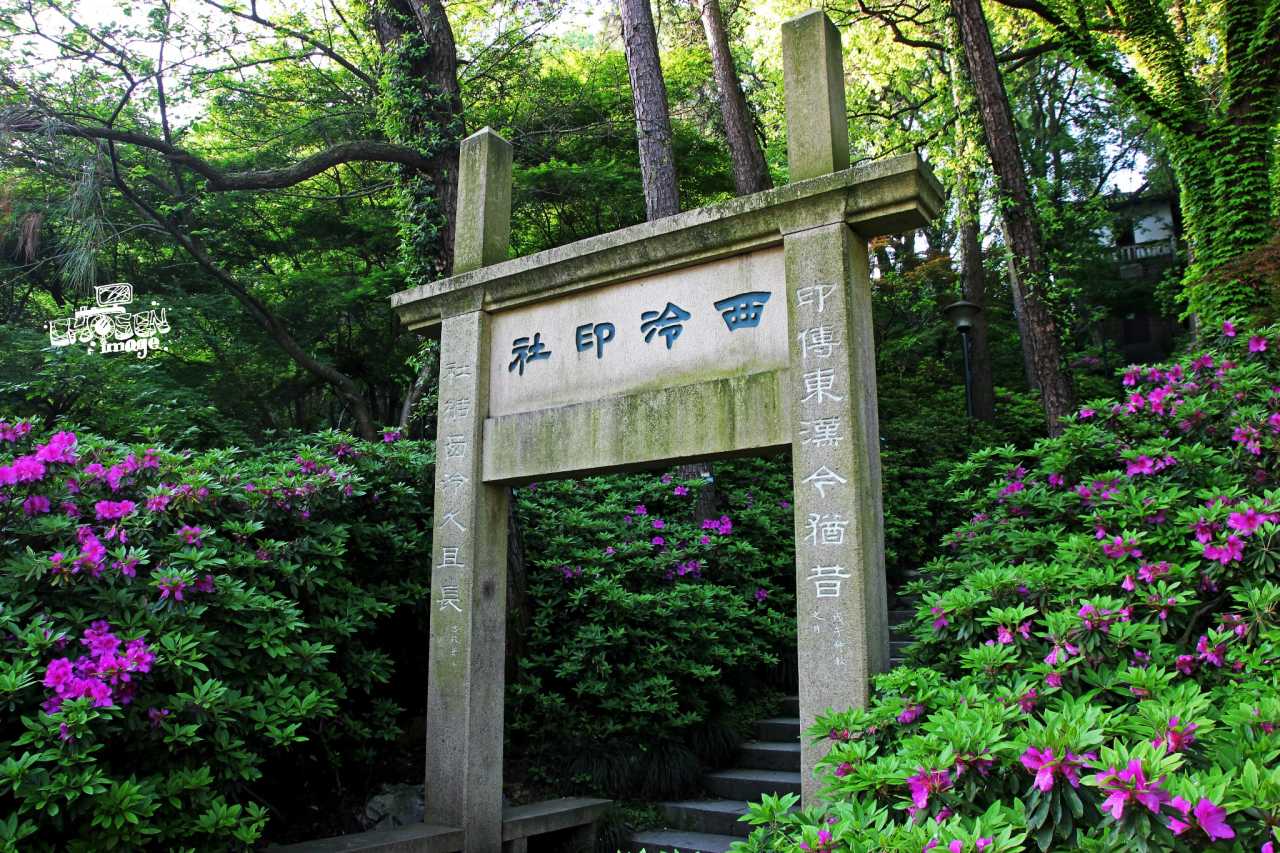 西泠印社后山的牌坊在花丛掩映下,古意丛生。