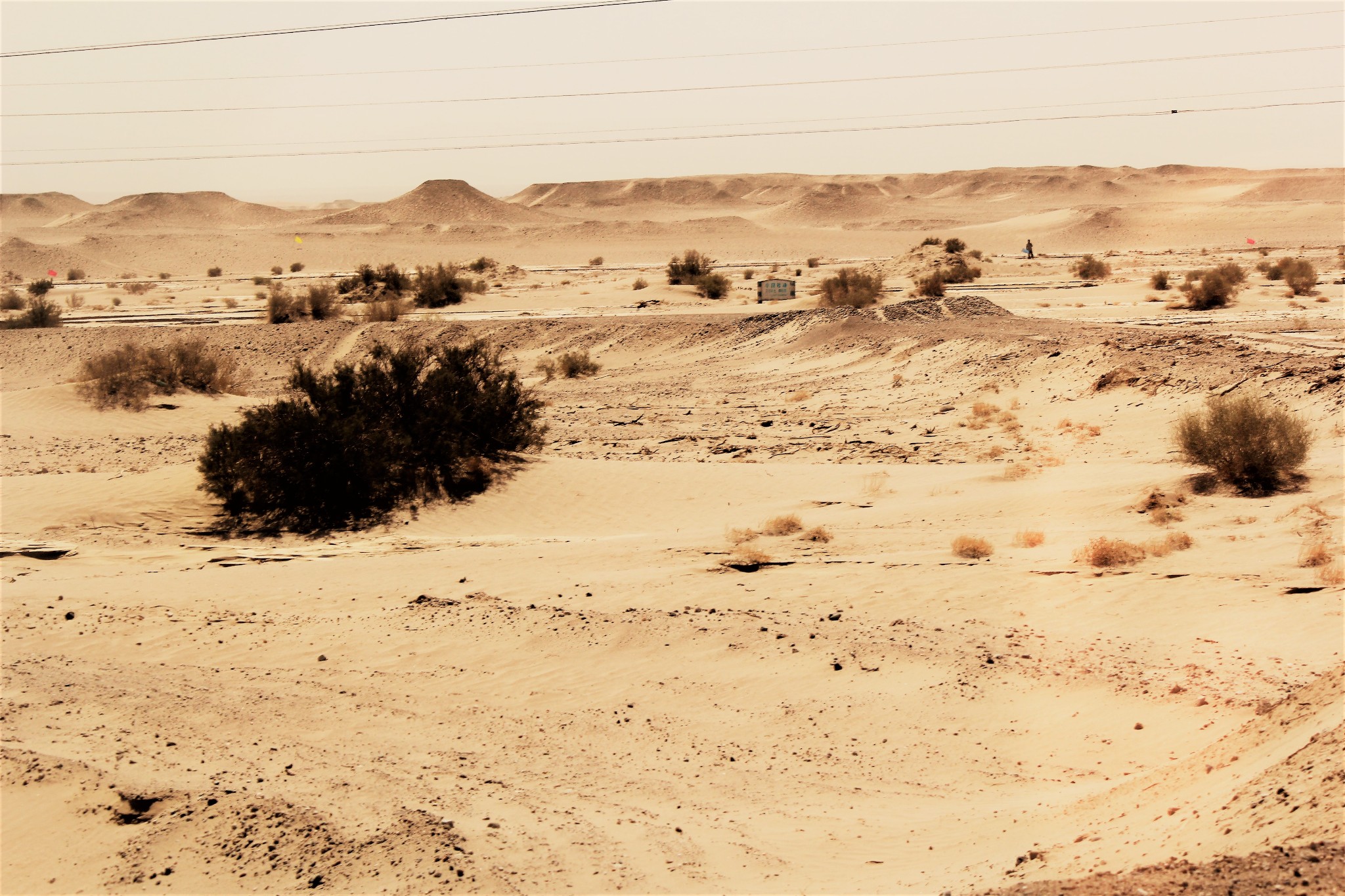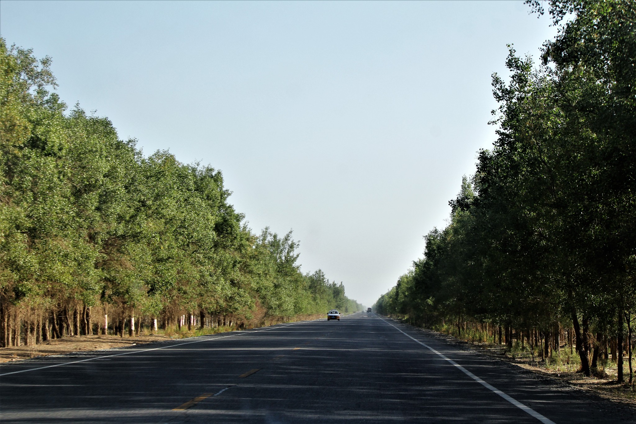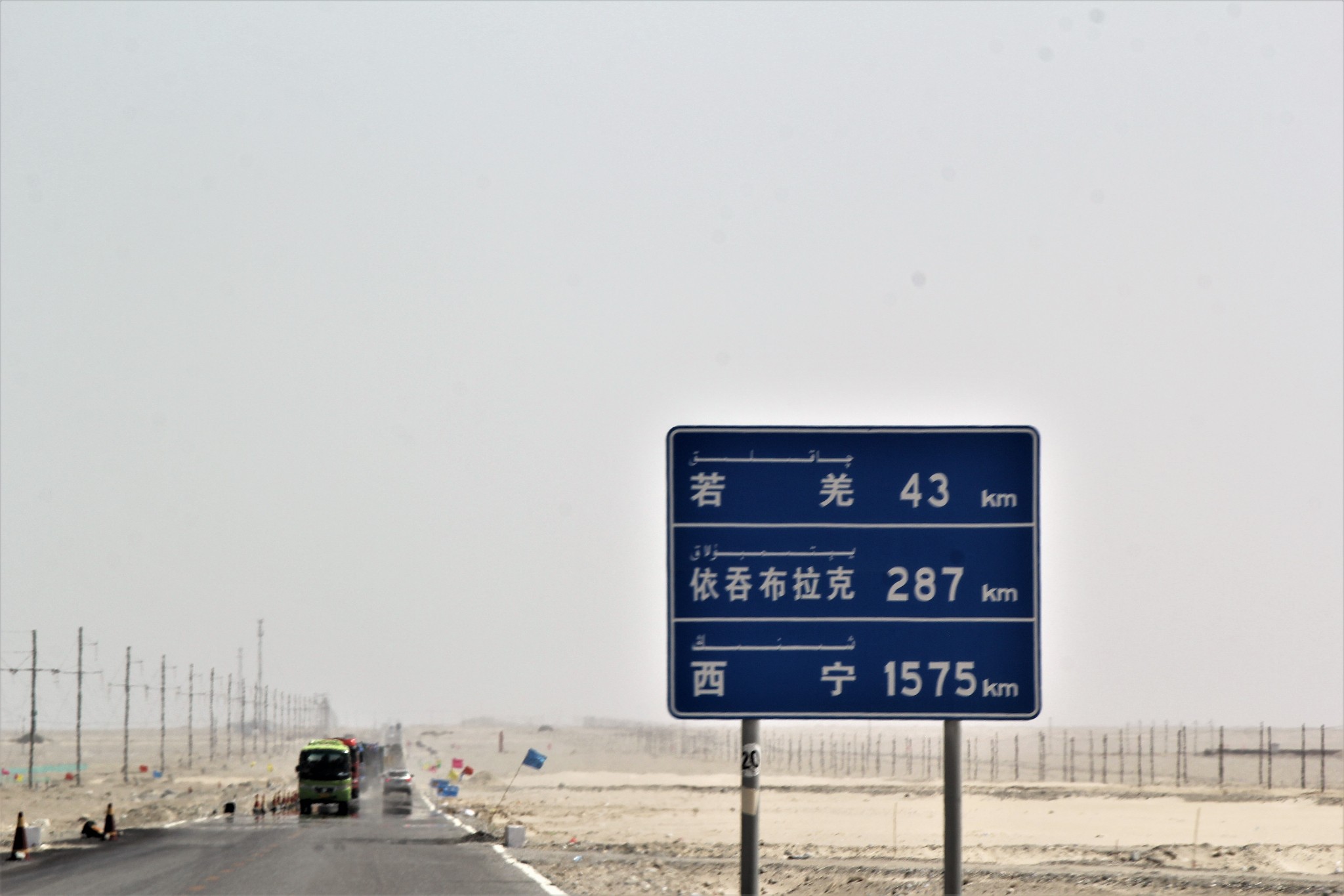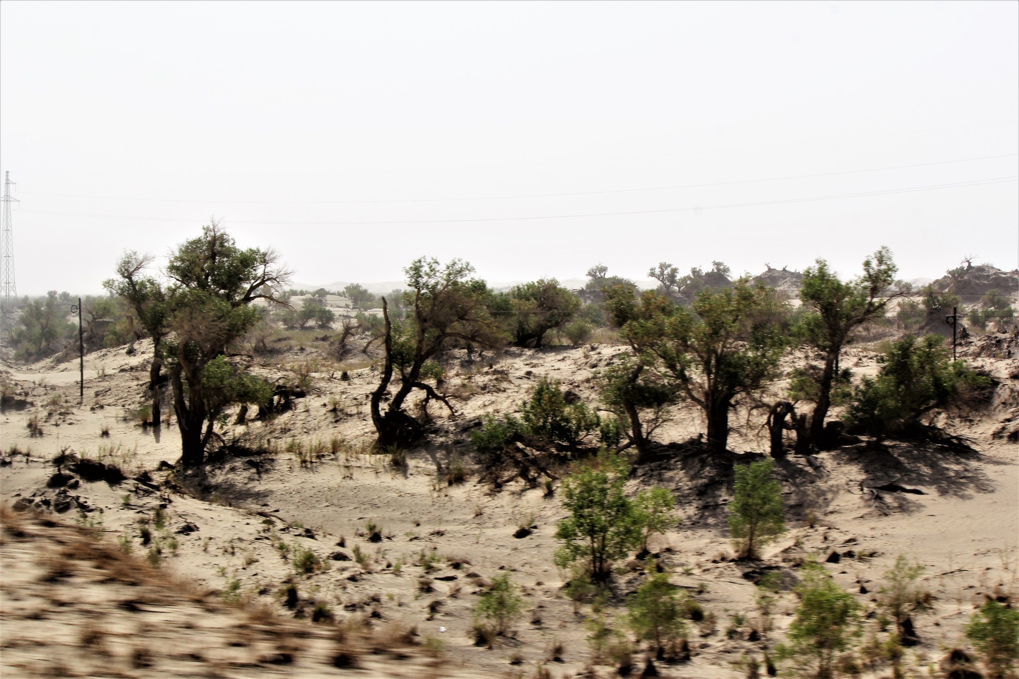 走出绿洲,公路两旁已无杨树,取代它的是灌木和芦苇。