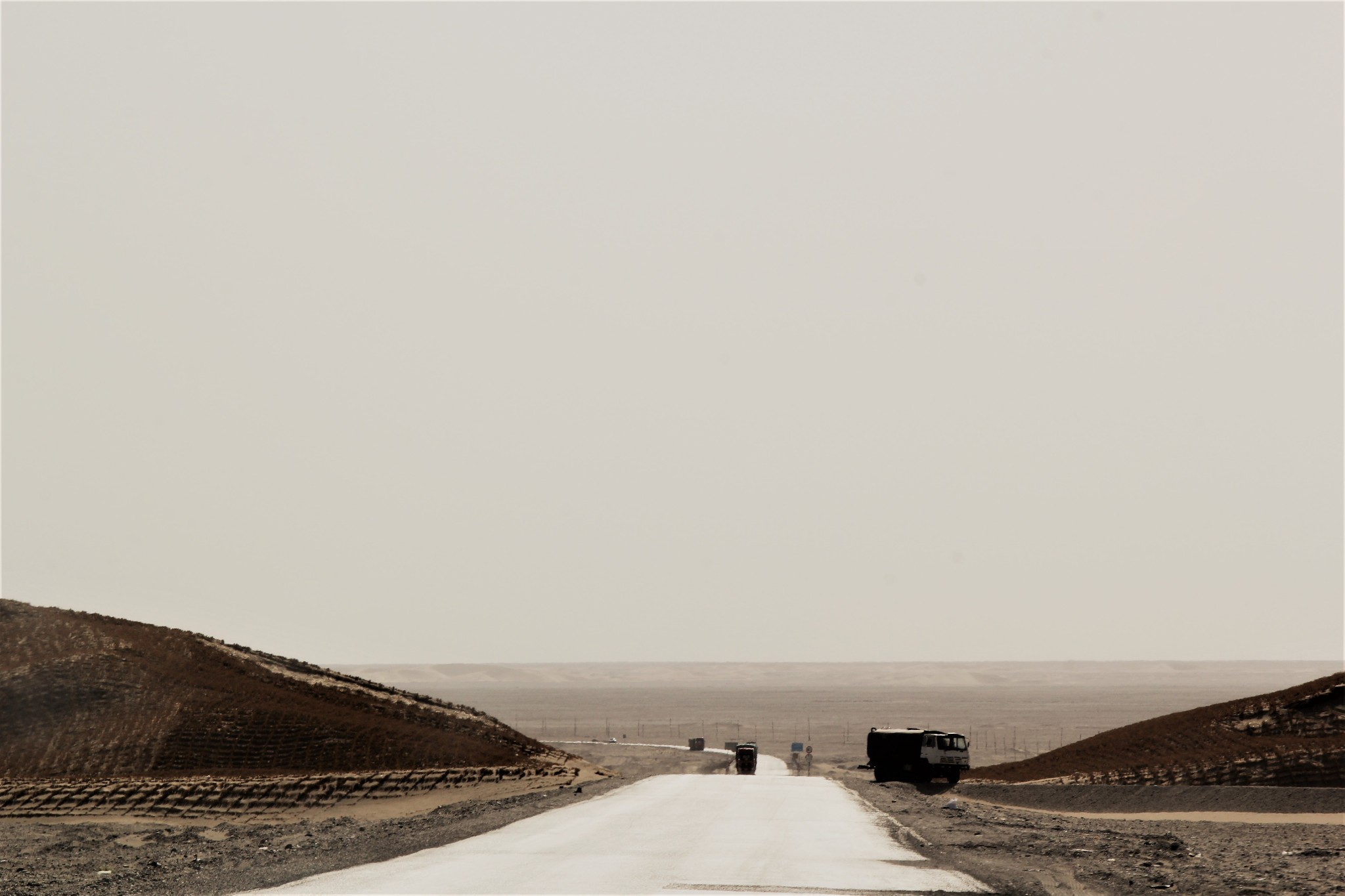 在茫茫沙漠和戈壁上,公路像一条银带,将一个个绿洲串了起来。