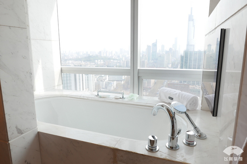 进到房间后,还是惊喜一下,完全超乎预期。看房型图,一层楼大概两间套房,在走廊最末尾相邻。我是10房型,看了论坛另一种套房房型,我认为更合理。首先厅比较方正,不像另一个房型,厅中间有个大圆柱。其次房间是270度角房景观,拉开窗帘后景观非常好。厅和房间都是正对玄武湖,视野开阔。正对玄武湖好像只有这两种套房房型,其他房型应该只能侧看湖景。再次,浴缸位置也非常有感觉,正对繁华城景主干道,黄昏时刚入夜时,对着城景泡个澡,很有感觉。当然,隐私性需要注意一下。