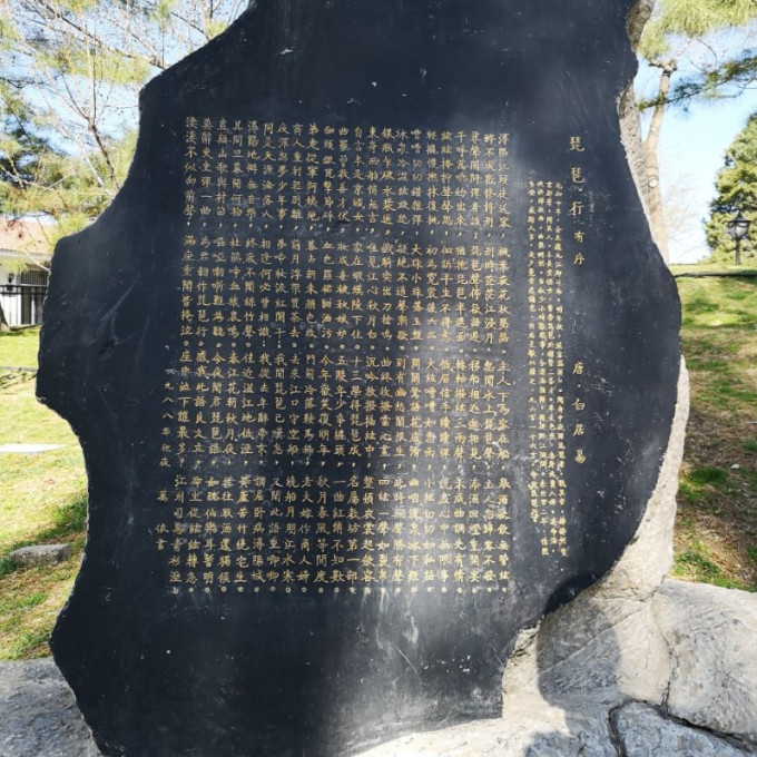 岸边离亭近处,立有一琵琶形巨石,上面铭刻了《琵琶行》的全文,乃著名明清宫廷史、音乐史学者、书法家万依所书。