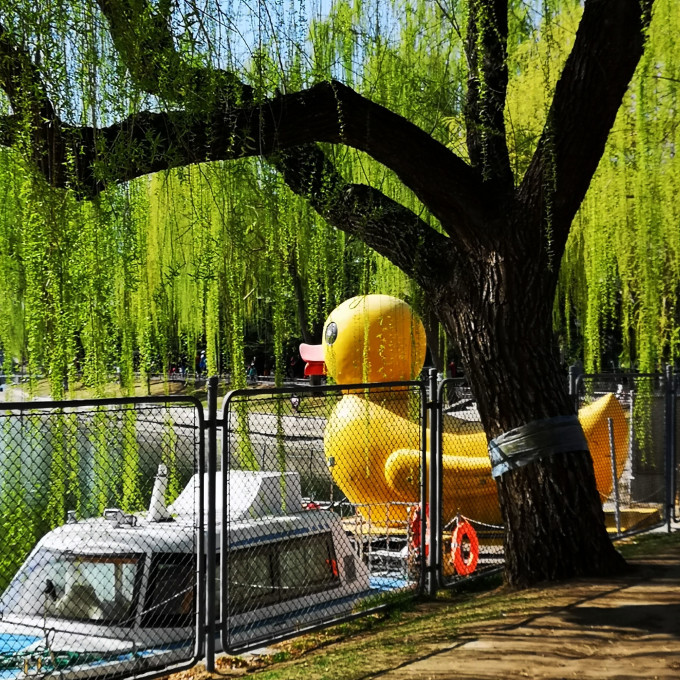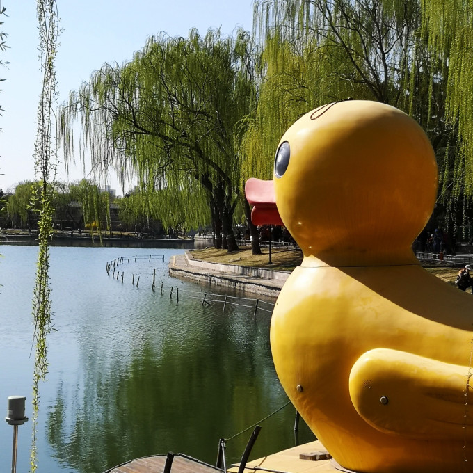 下到湖边,景很美,看到萌萌的小黄鸭。