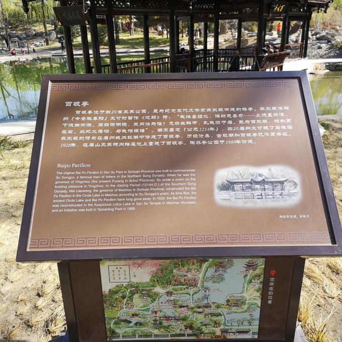 百坡亭是仿建四川省眉山市三苏祠内建筑。百坡亭始建于南宋嘉定七年(公元1214年),乃四川眉州太守魏了翁所建,原亭位于眉州城内环湖中,后,湖与亭均不复存在。1928年,在三苏祠瑞莲池上重建。此处是1989年仿建的。