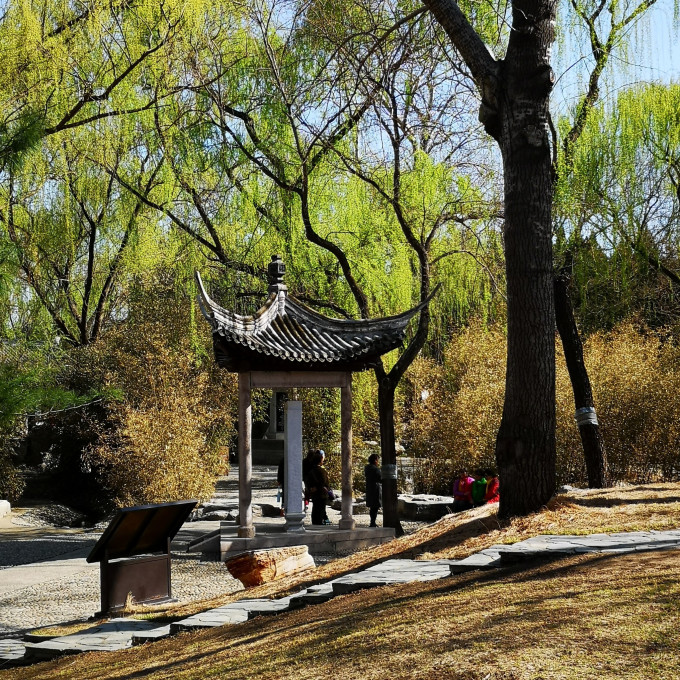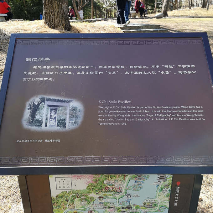 再往前走,看到个三角形的亭~鹅池碑亭。此亭灵秀轻盈,亭内有镌刻着“鹅池”二字的石碑,亭前有形状自然的小池塘,雕白鹅于池中嬉游,应时应景,生机盎然。