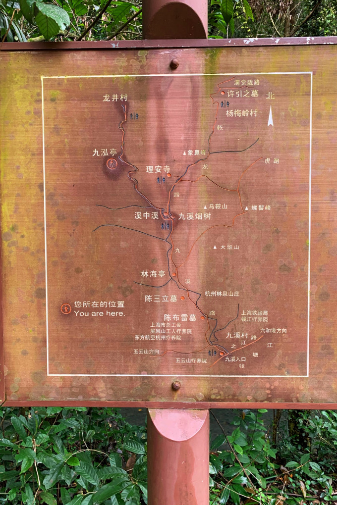 九溪烟树俗称“九溪十八涧”,北接龙井,南贯钱塘江。我们经九溪烟树公园往龙井村方向步行,大概用了两个小时。