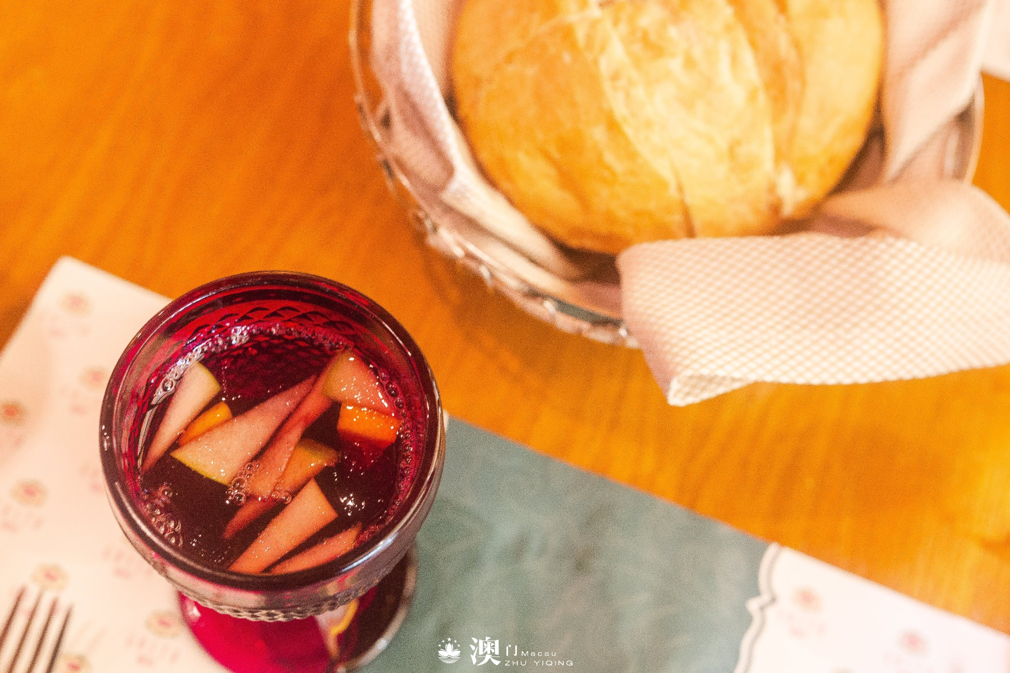 吃正餐前,一般先来一杯葡国水果酒。他们家的面包表皮烤的非常酥脆,配上特制辣椒酱,边聊天边扯着面包吃,差点就把它当主食了。