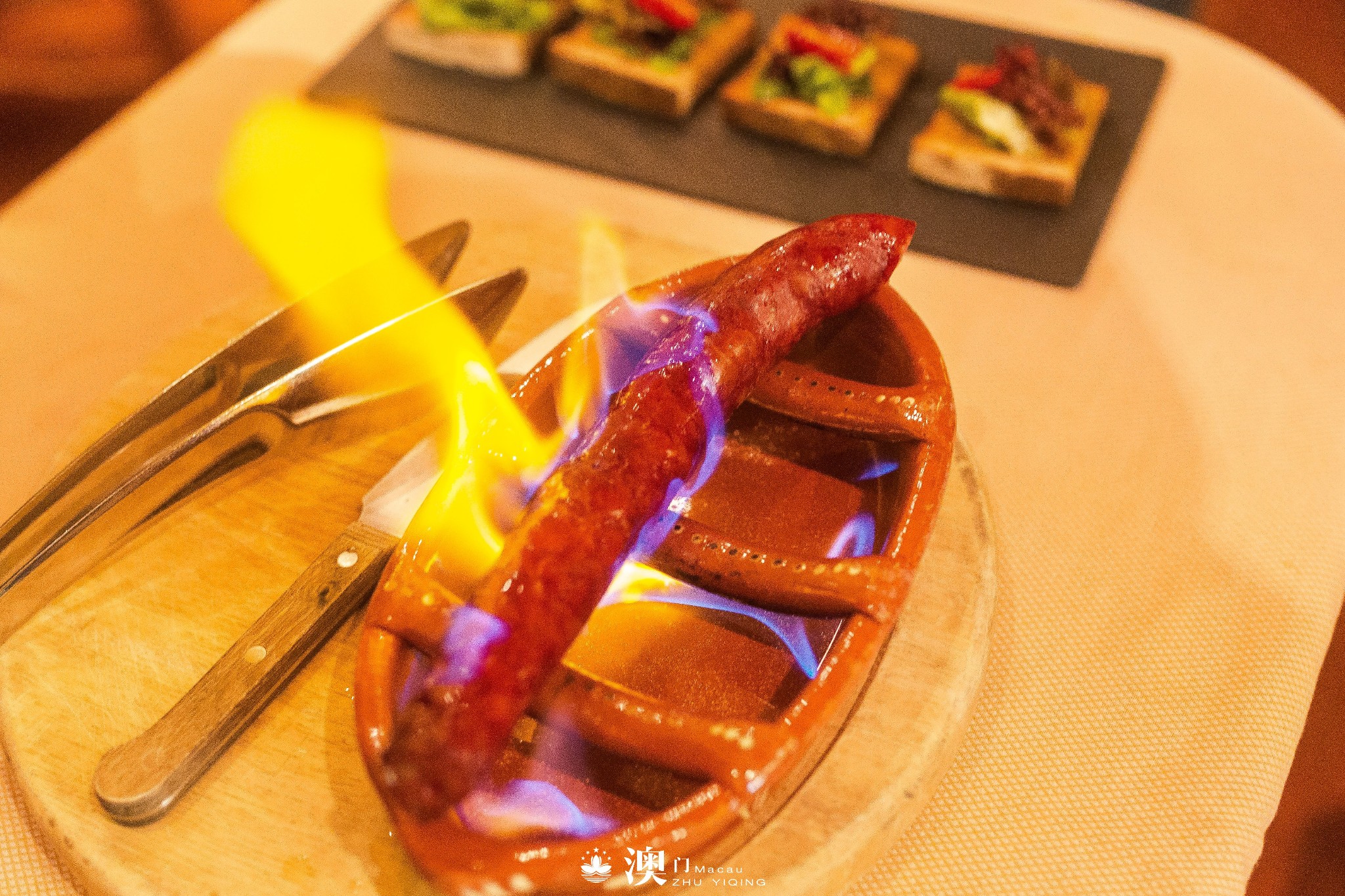 正餐Time到,先来讲讲我最推荐的葡国菜,白兰地烧葡国肉肠,整个火烧的烹制过程都是在我们面前呈现,服务生一边向葡国肉肠浇白兰地,一边翻着肉肠,肉的熏香随着白兰地的香气扑鼻而来,肚子已经忍不住了。