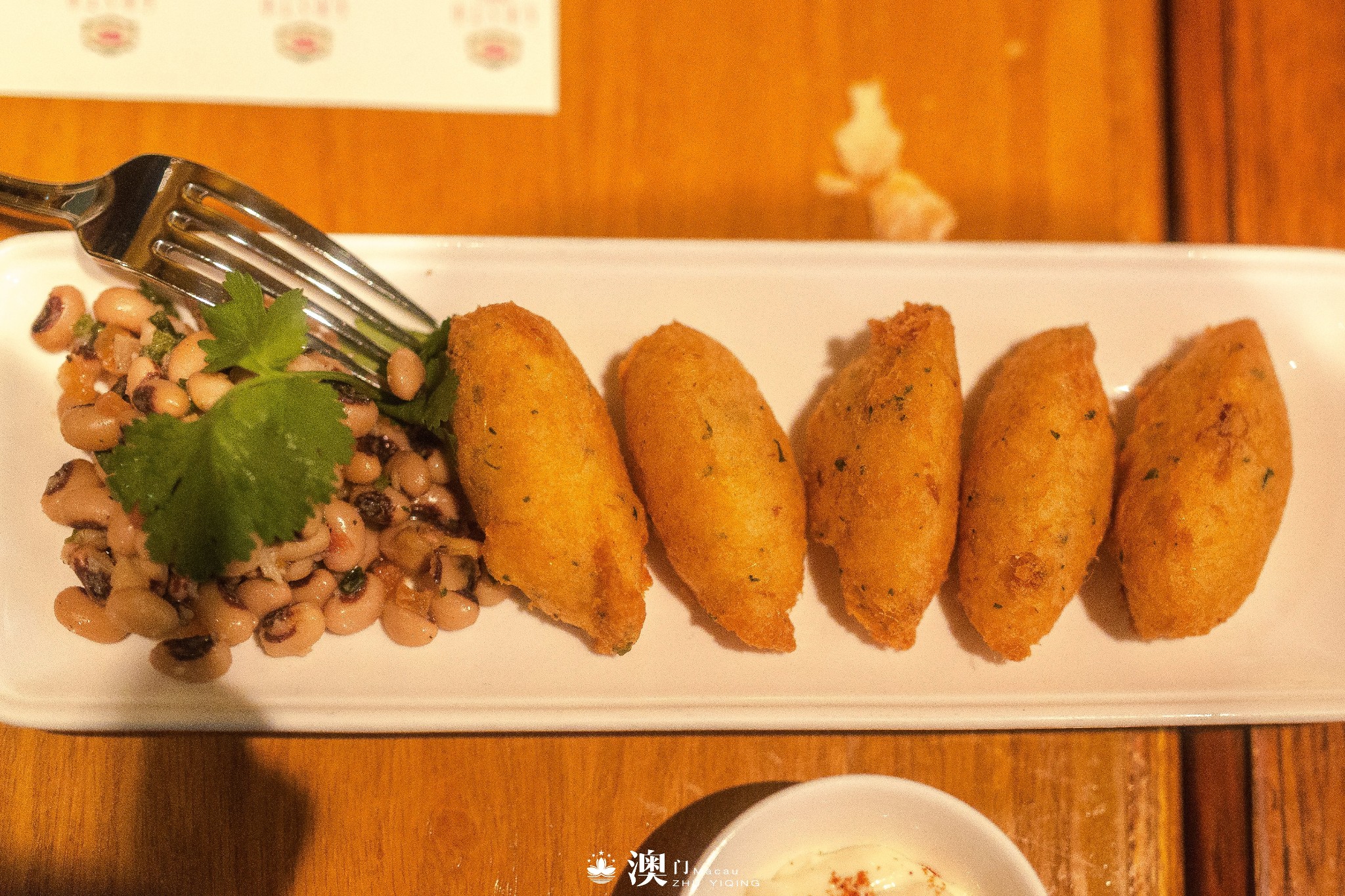 炸马介休球,从外观看不知道是什么,一咬下那金黄脆脆的表皮,原来包裹的是Q弹可口的虾肉,可以蘸一蘸他们的特制辣椒酱,搭着豆子,特别好吃。