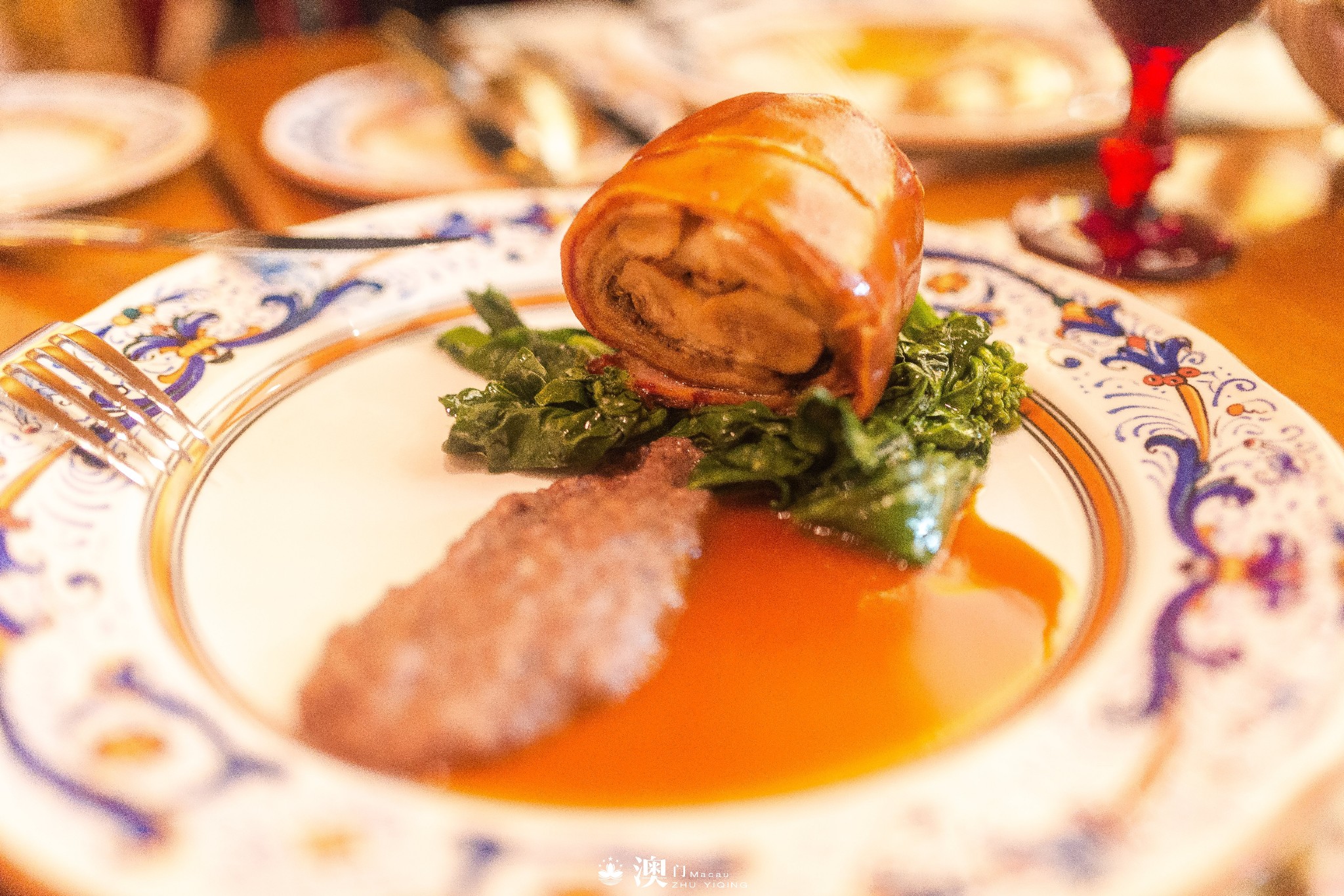 烤乳猪配芥兰黑肠茸,烤乳猪是一道功夫菜,需要反复翻转猪蹄子,才能保证每一寸的表皮都能烤得非常均匀。猪蹄子金黄锃亮,口感酥脆,里面的肉早已软烂到可以直接融化于口中。