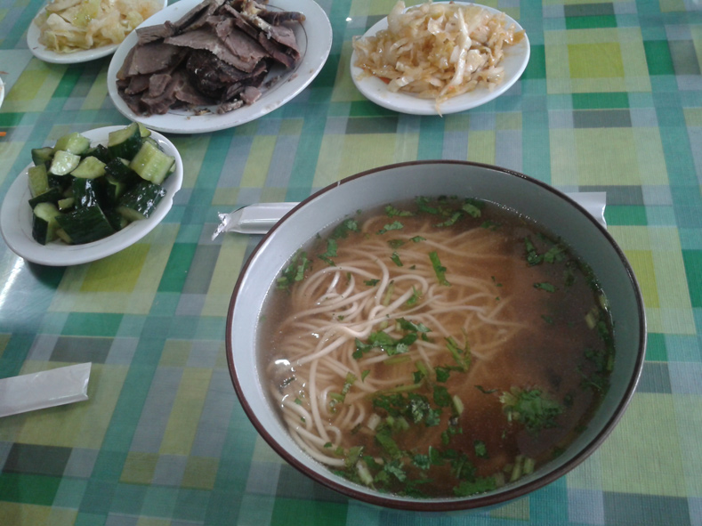 到了华辰大厦,因为客房还没腾出来,我们就先去吃早餐。听早几期的团友说大厦附近有一家牛肉面店不错,就按指示找了过去,来到一家双裕牛肉拉面店,这里的牛肉面汤水带了点辣,味道果然不错。吃过早餐,回到酒店登记了住宿,就开始兰州市区一日游。