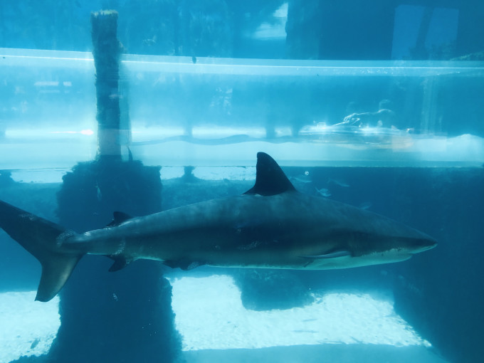 一次性只能滑一个人。从最高点滑落至水池中用时10-15秒。人从几乎90度垂直的金字塔建筑滑梯笔直滑入鲨鱼池中。惊险刺激。滑梯没有弯道,直接划到水池里可以看到鲨鱼从你的身边,你的头顶游过。
