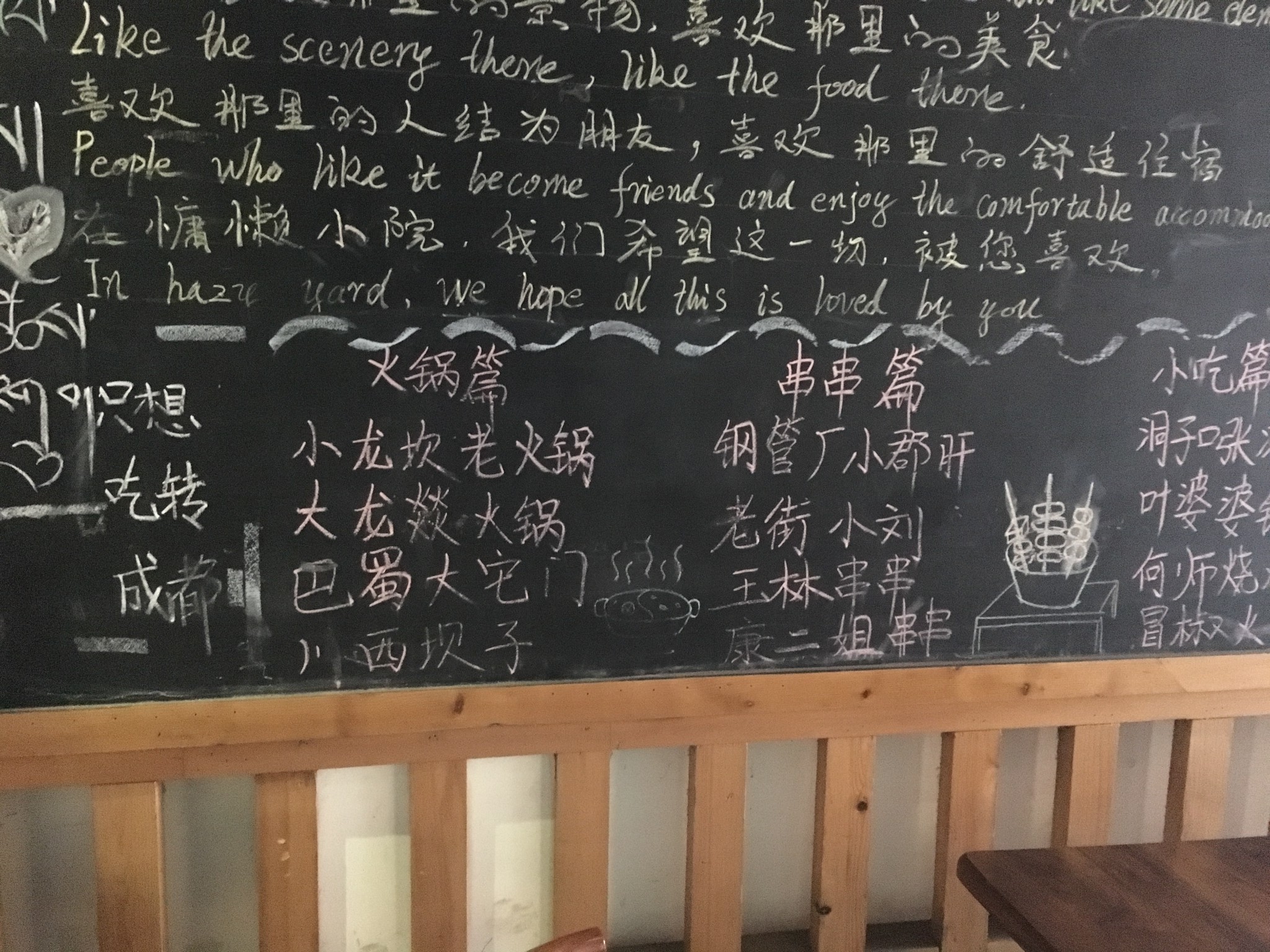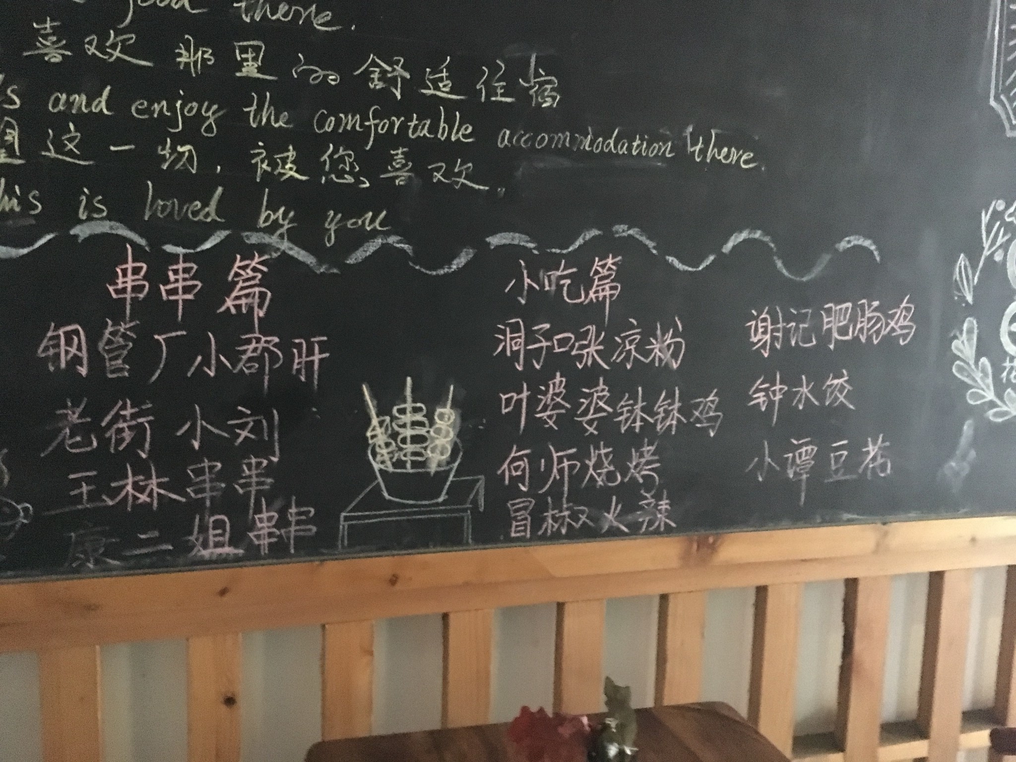 客栈一楼有一个咖啡厅和倦了茶舍,我没有去消费,有兴趣可以试试。客栈小黑板还有美食推荐。我们去试了老街小刘串串,很不错。