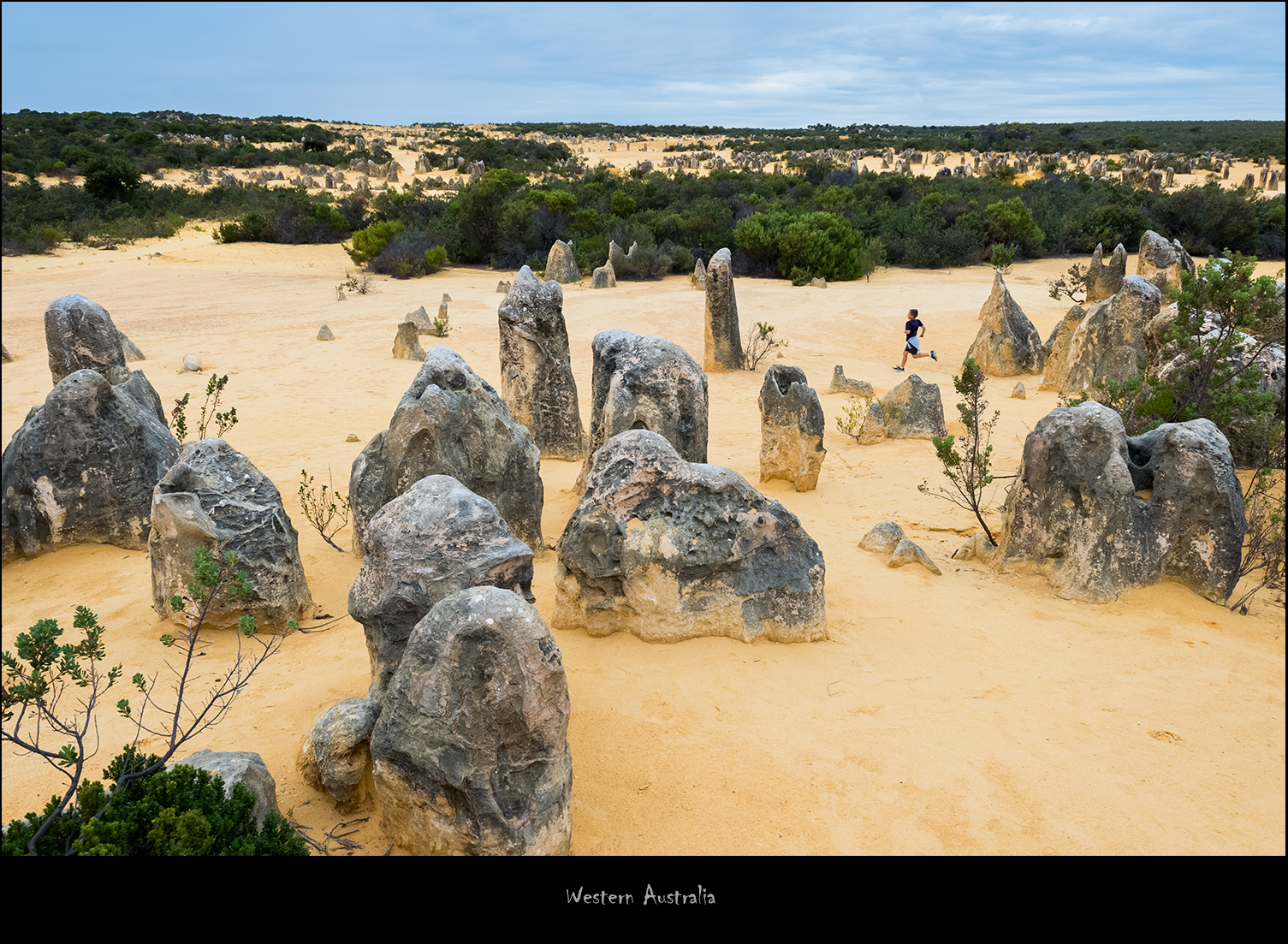 继续往北开90公里会看见另一处截然不同的自然奇迹,叫做尖峰石阵(The Pinnacles Desert)。这名字听着就像武林高手的梅花桩,看起来也像,不过蹦完所有的石柱这位高手一套拳法可能要打上一个月。这个位于南邦国家公园(Nambung National Park)中间的石林居然在1967年此地成立自然保护区之前还鲜有人知道。从地质年代来看,尖峰石阵也算是很年轻的。它大约形成于50万年前的第四纪冰期,贝壳的残骸在海床的沙子中沉积下来,形成富含碳酸钙的砂石。之后在沿岸处混合了河流从内陆带来的石英砂共同聚合成坚硬的石灰岩。随着岁月变迁,沧海桑田,强风吹走浮沙,无数光怪陆离的石灰岩柱因此浮出视线。有证据显示这些石柱在形成之后直至6000年前都默默被埋在地下,之后因地质环境变化而露出地表,又再次被沙丘掩盖,直到距今只有几百年前的近代才重见天日。