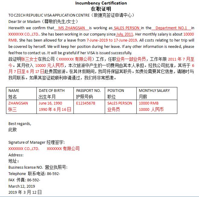 •在职证明*1份/人:英文版,我们是直接用的中英文双语版并加盖公章,用公司抬头纸打印,给单位的相关负责人签名,直属上级即可。