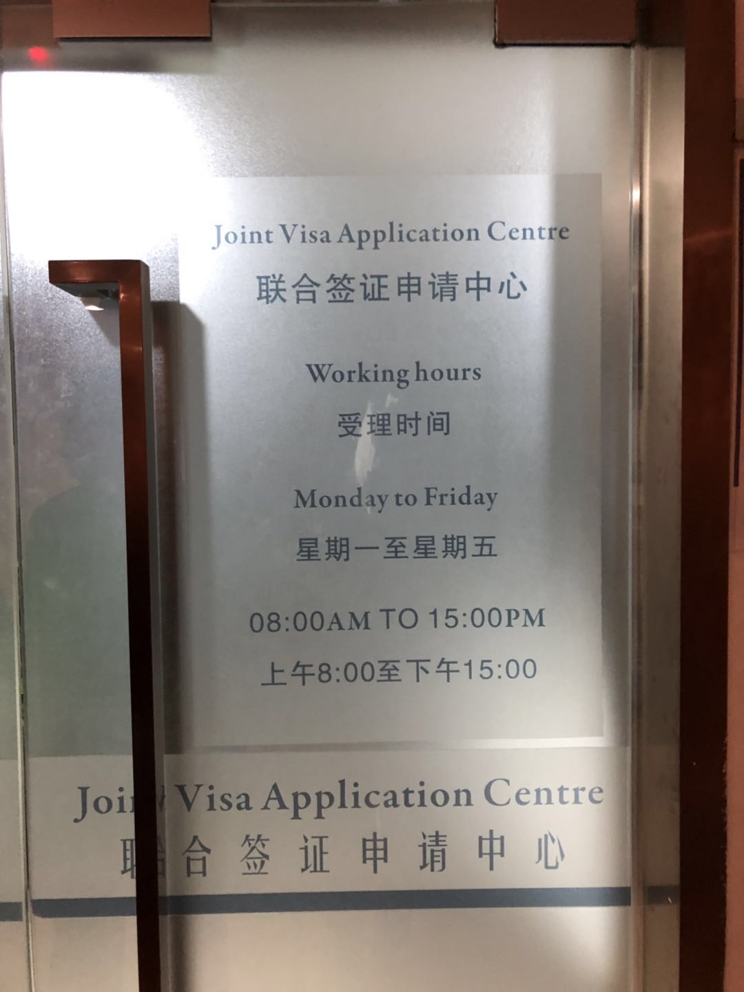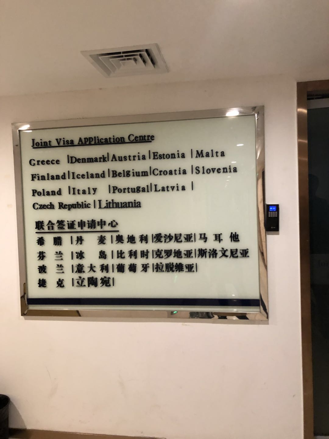 2、到了15楼根据路牌指示找到联合签证申请中心。联合签证中心8点开门,我们7点55分到那边,排的第一个。不过等我们办理完要走的时候,人就不少了,大概有10来个人在排队。进门后,告诉门口的小姐姐你是要去哪个国家的,办的是什么类型的签证(旅游、工作或探亲等),出示事先填写好的申请表。