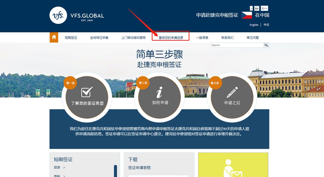 1、 登录捷克签证中心官网,点击查询进度的选项,就能进入查询界面了