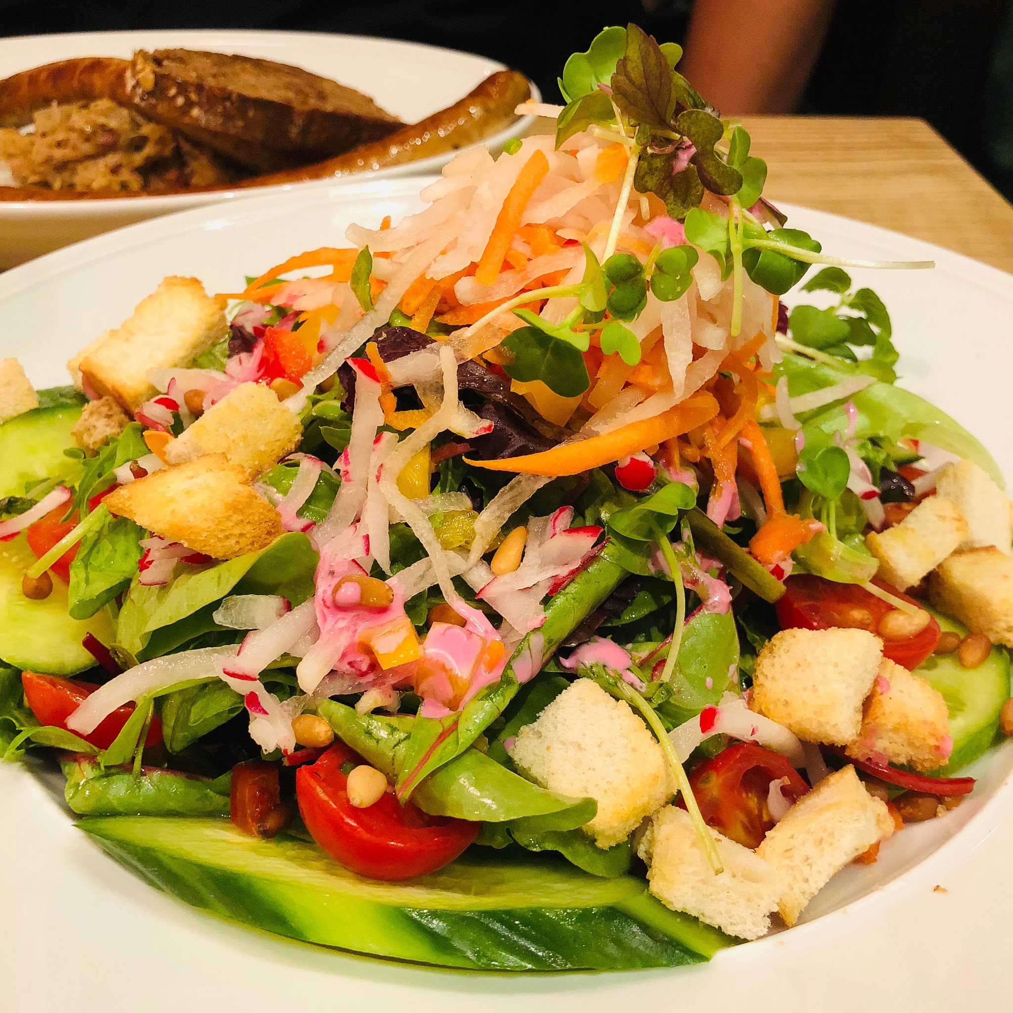 配土豆面球,脆皮非常好吃就是刀叉不好切。土豆面球实在是无法接受,纯土豆球会好吃的多,肘子下面是酸菜,emm,味道很难接受,然后要了份德国大香肠