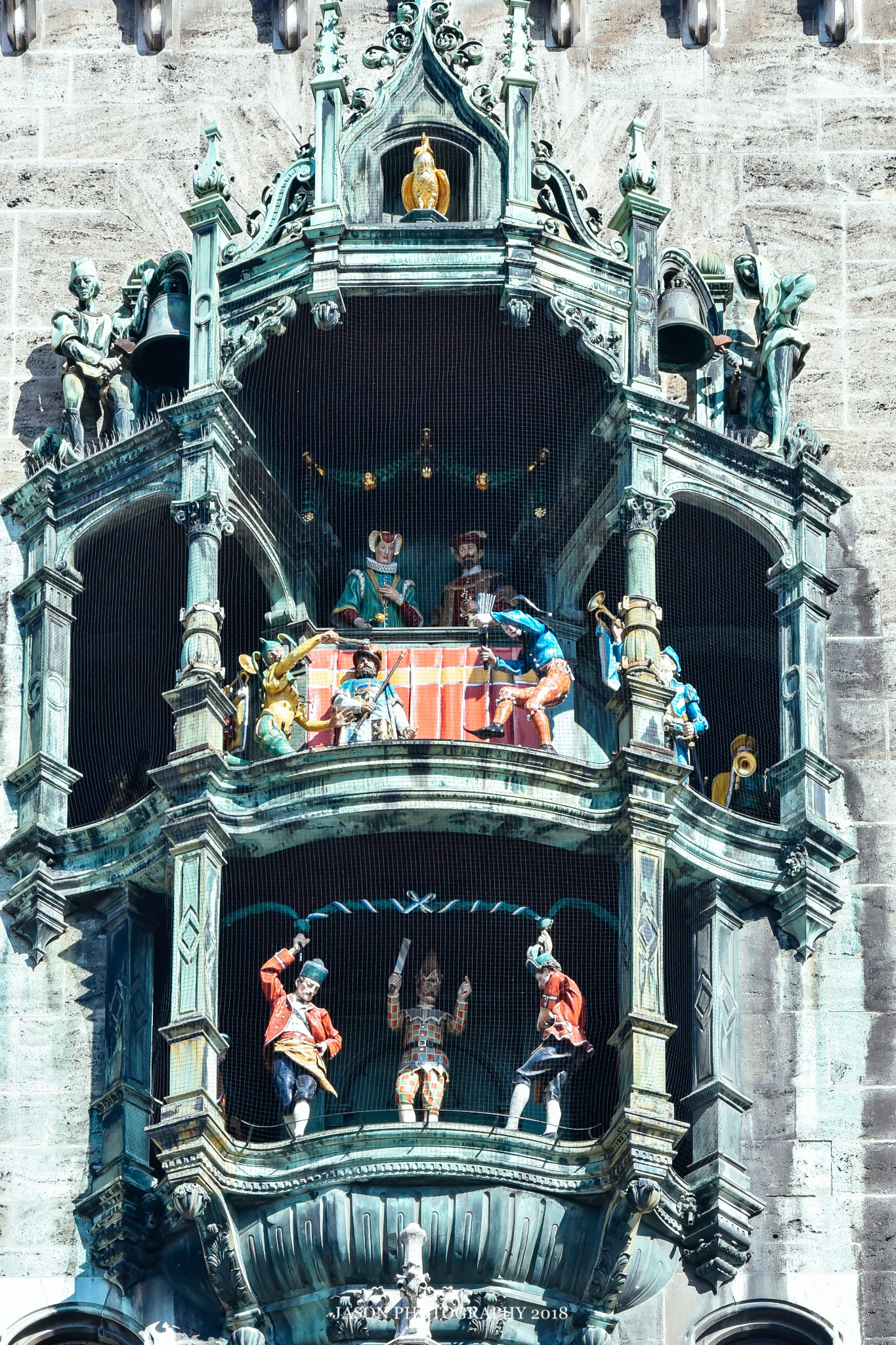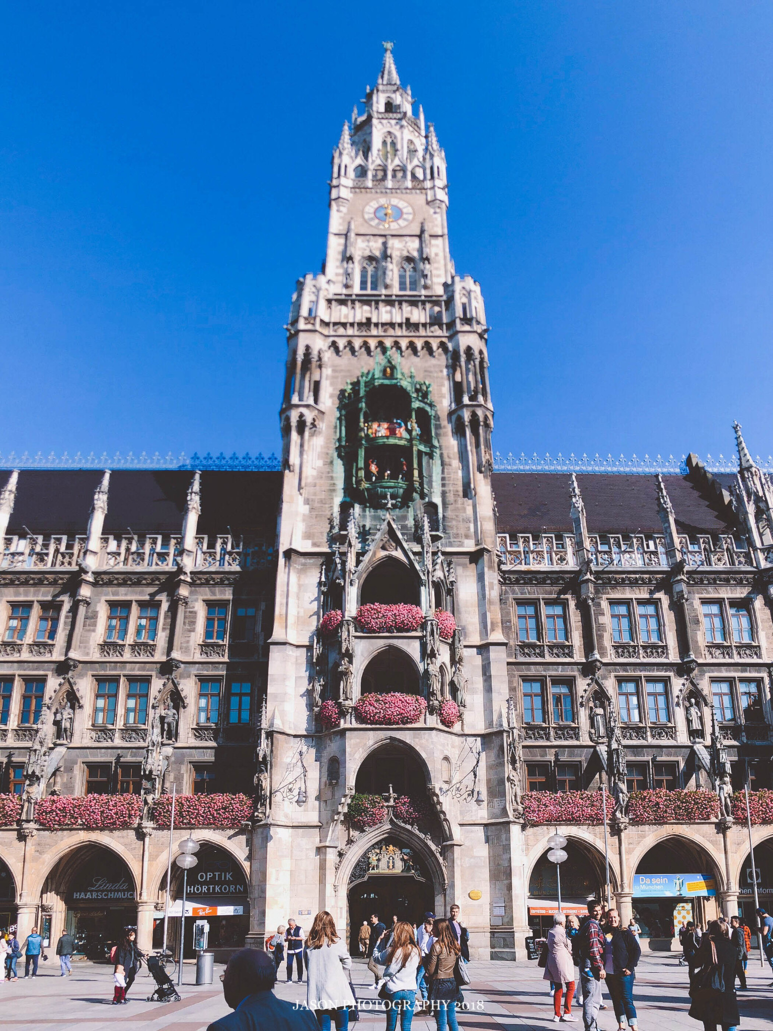 每逢11点、12点整点(3-10月还有17点和21点整点),新市政厅塔楼上会有著名的钟楼乐器表演(Glockenspiel),以一组木偶演绎出数百年前慕尼黑一位国王的婚礼场景,非常值得一看。
