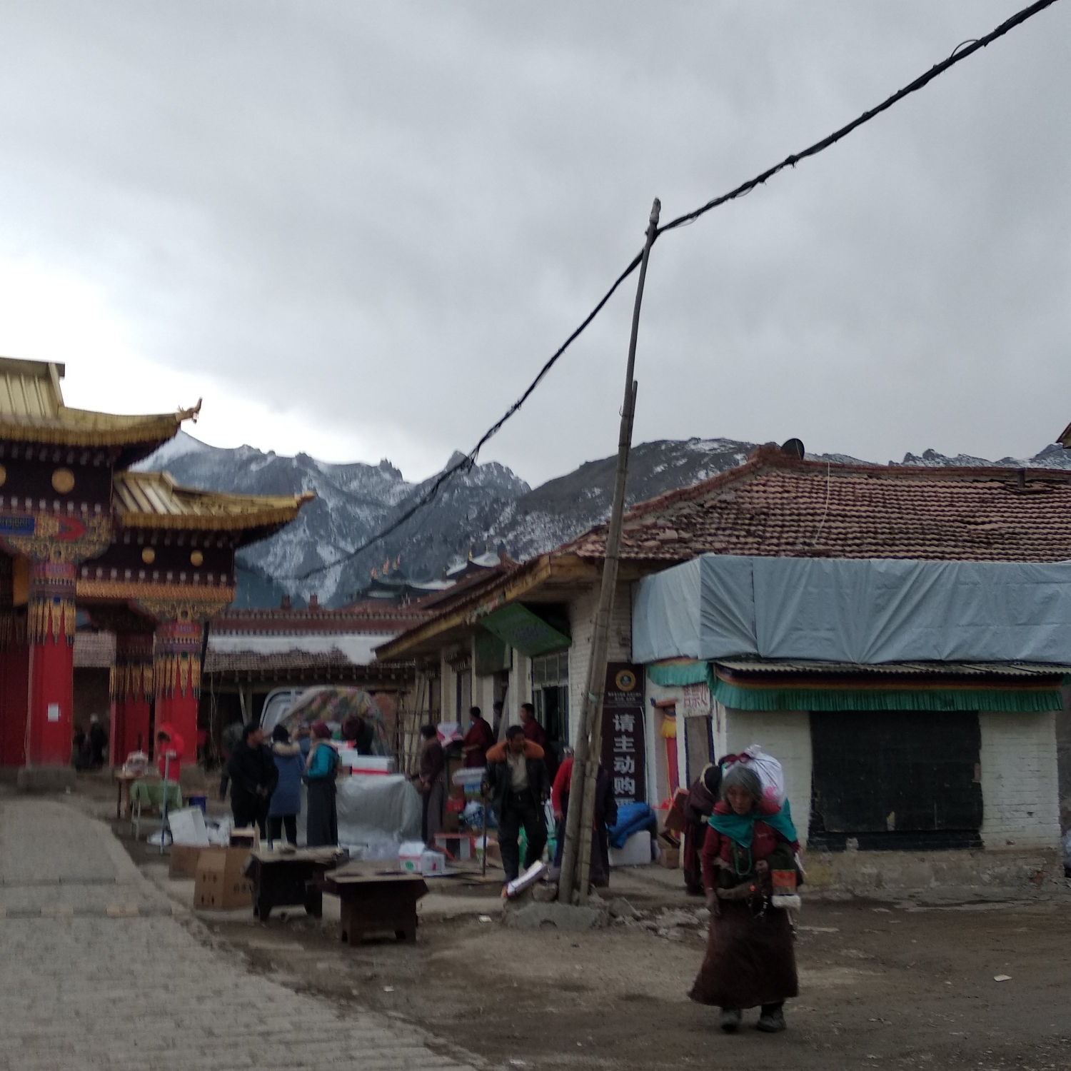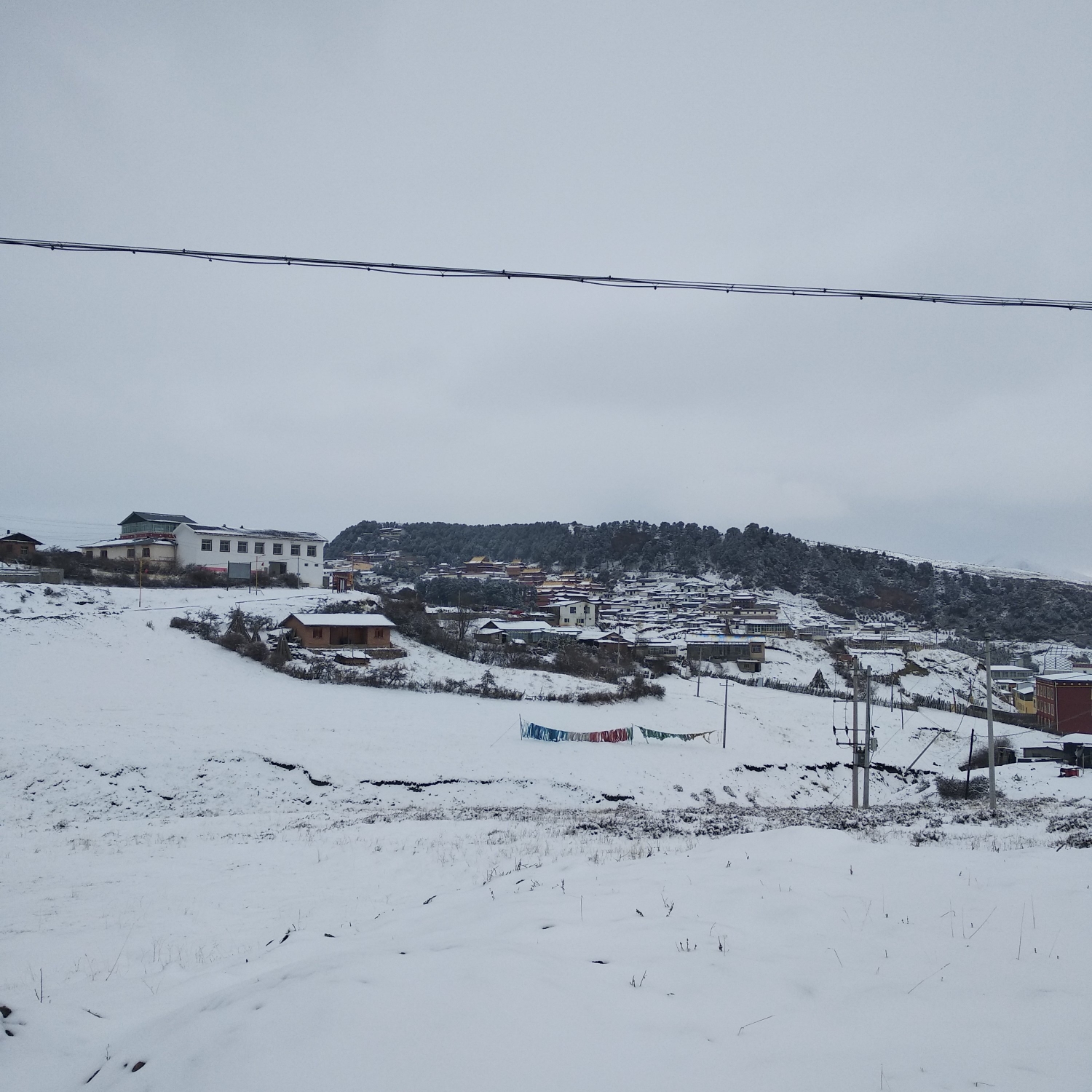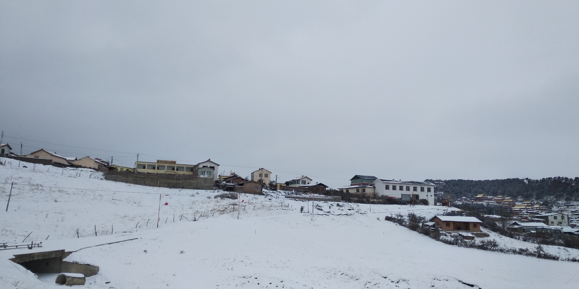 次日醒来,属实没有想到下了大雪,足足三尺厚,于是和同行的大叔开始担心今天的展佛活动是否会如期举行,洗漱过后,小心翼翼的下了山,前往甘肃境内的郎木寺,早餐在郎木寺交叉路口的早餐店吃了十元钱自助早餐,一碗粥,一个鸡蛋,一个馒头,一个花卷,还有不限量的泡菜,店主是回族人,人很好,之后还帮了我忙,推荐大家早餐可以过去吃,便宜又实惠。