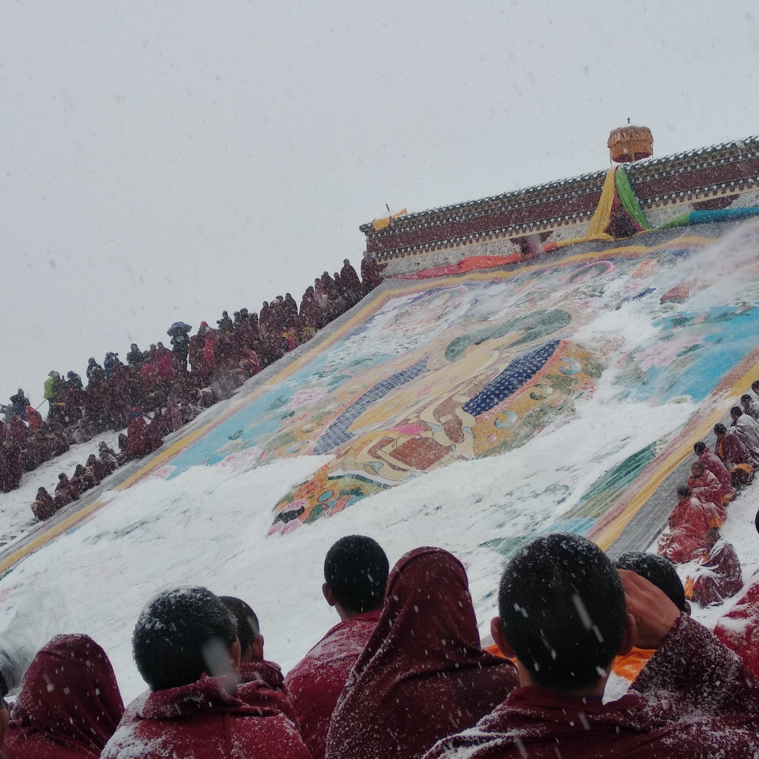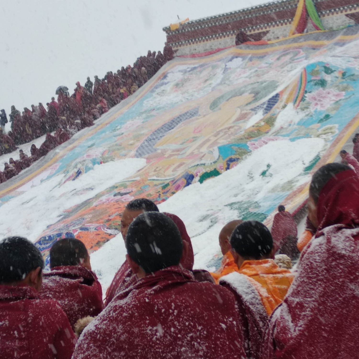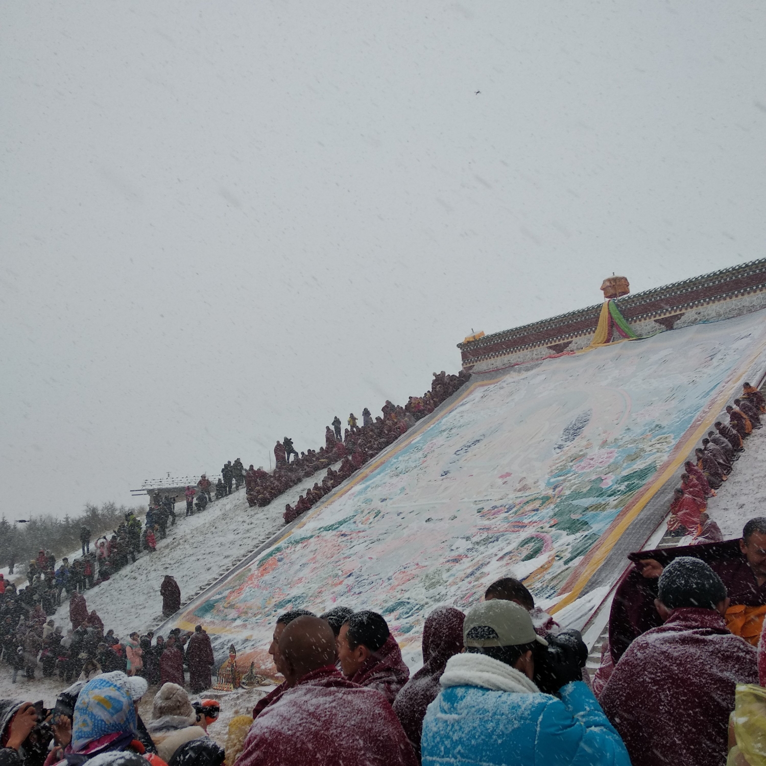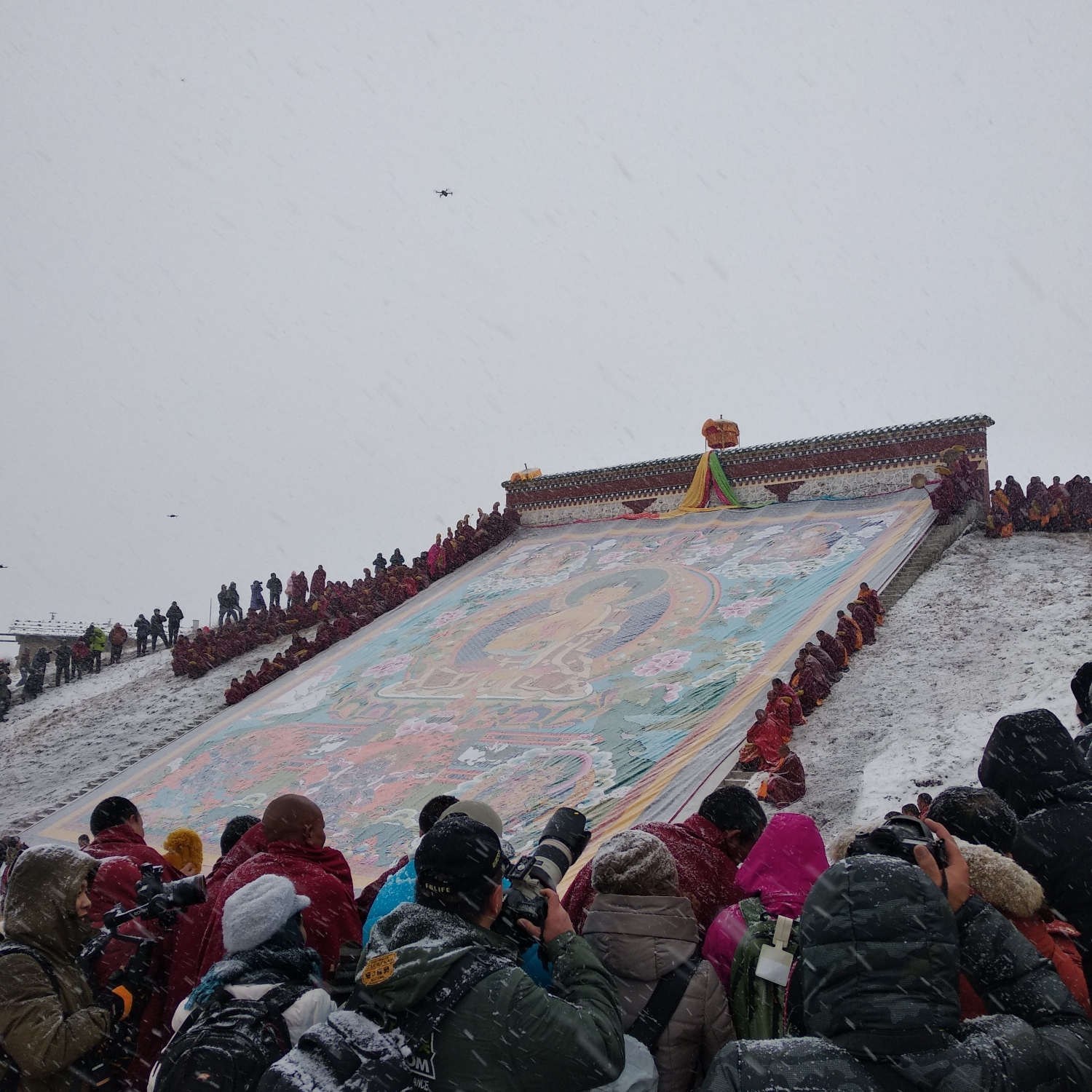 到了展佛台前仪式已经开始了,雪花还是不断,甚至有越来越大的迹象,此时佛像已经抬上了晒佛台,随时准备开始仪式,周围的人群都开始骚动,拿着长枪短炮的老法师们纷纷开始对自己的机器做一些保护工作,以免雪大让相机受潮。