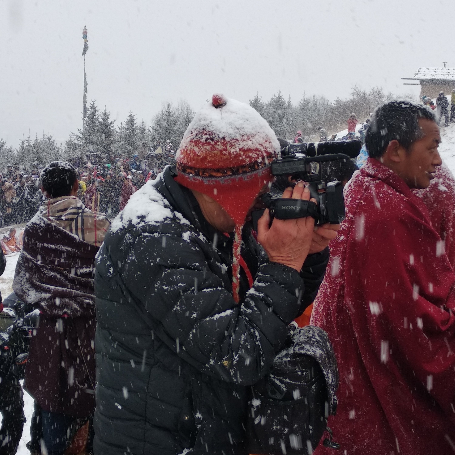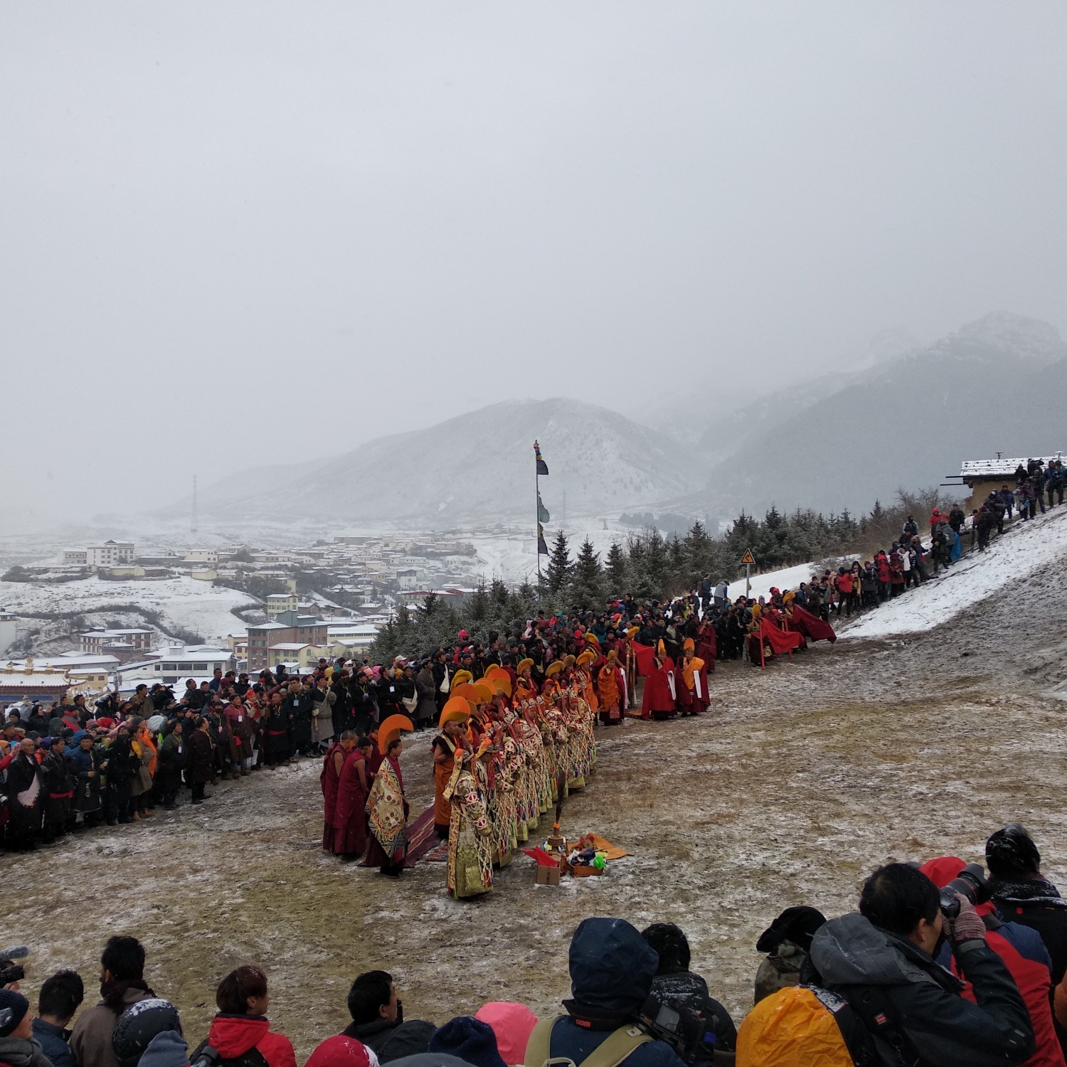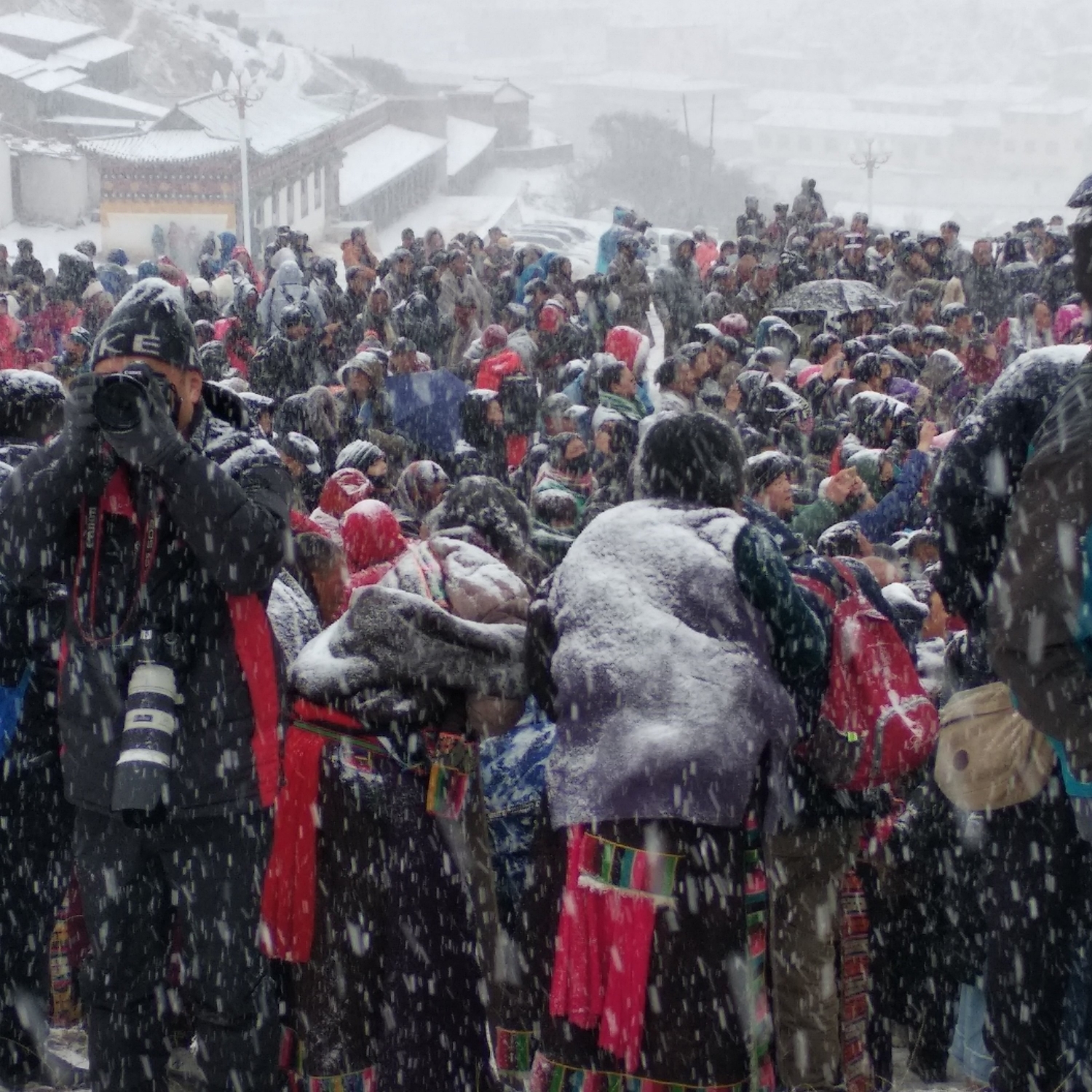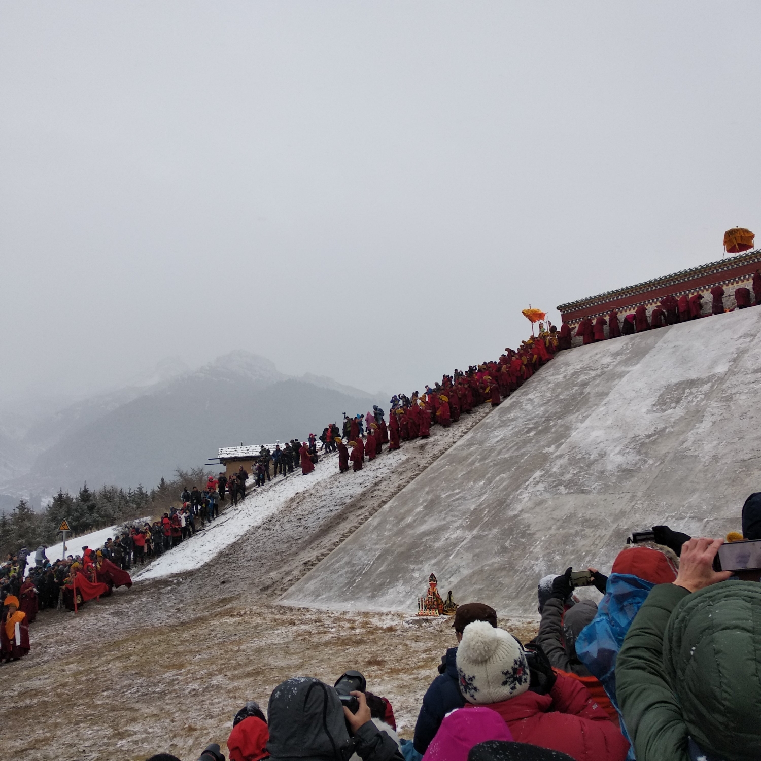 到了展佛台前仪式已经开始了,雪花还是不断,甚至有越来越大的迹象,此时佛像已经抬上了晒佛台,随时准备开始仪式,周围的人群都开始骚动,拿着长枪短炮的老法师们纷纷开始对自己的机器做一些保护工作,以免雪大让相机受潮。