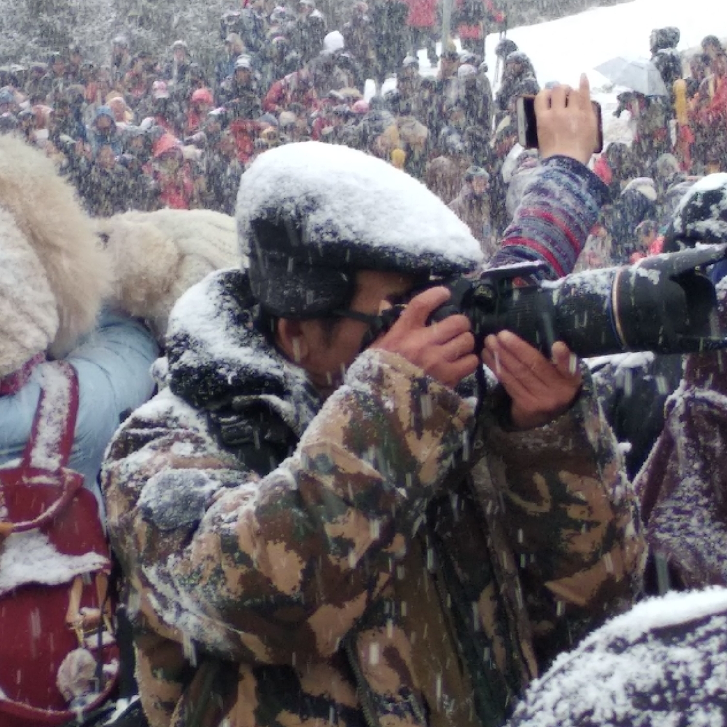 而随之,瑞雪降之,瞬间将佛像掩盖,雪大的我甚至都看不清前方的那些人群,手机几乎没办法工作,自己的黑卡也因为怕受潮,暂停了工作,大叔的尼康全是冰雪。