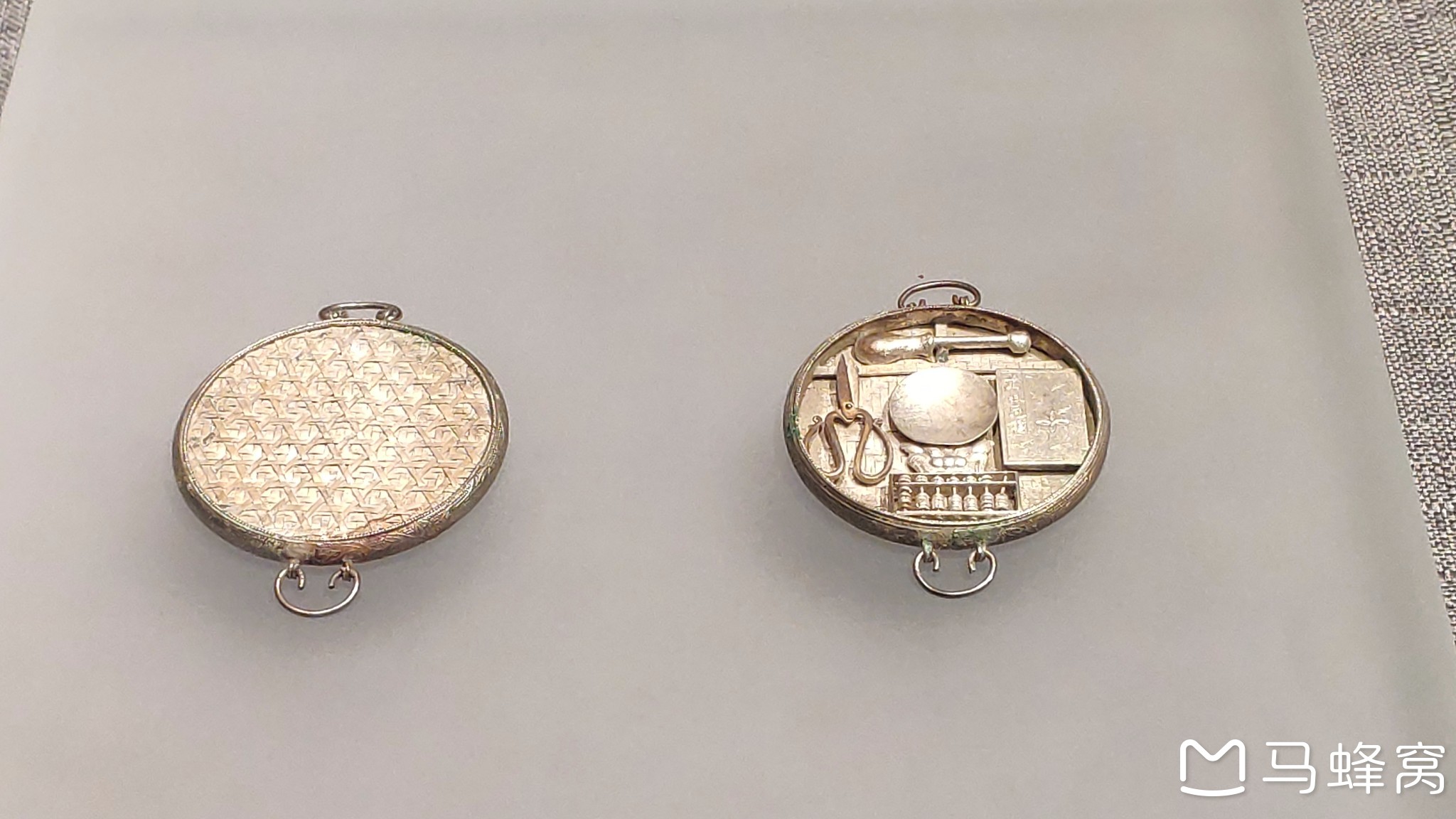 小挂饰。右边的有称,算盘,剪刀和书。书上还有字,但无论如何看不清。不知道这个东西是何寓意。