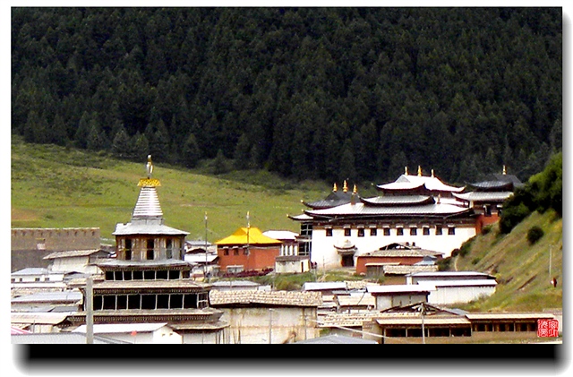 郎木寺沟里有两个隔河相望的郎木寺,藏文名字很复杂,给简化一下:甘肃的叫金顶庙,四川的叫银顶庙。郎木寺名声在外,很长一段时间老外背包客多于国内游客,小镇上满是异国情调的咖啡屋和国际青年旅社。