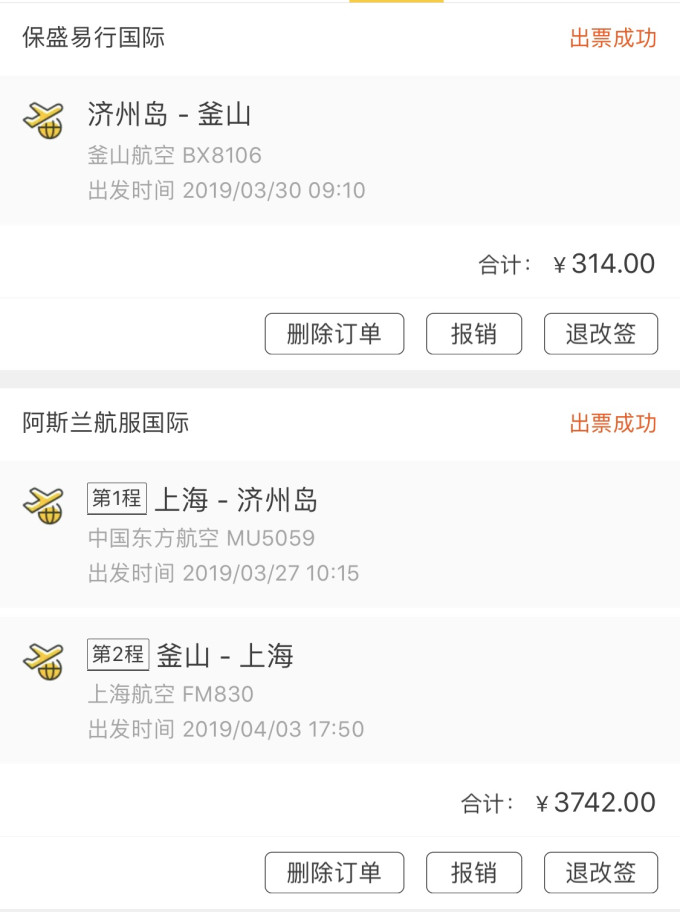 东航(上航)的两段机票,两张3760,实际支付3742.00(用了18元飞猪春运红包),济州到釜山两张只要364,实际支付314.00(用了飞猪的国际机票50元优惠券),如果没有优惠券的话,在釜山航空官网直接购买好像比优惠前便宜些,但是不知道为什么始终无法操作购买成功,反正157.00/人已经足够低价了……