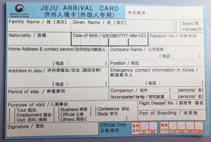 济州岛是一个免签的海岛,所以选择济州岛旅行的便利之处就是不需要提前办理签证,在飞机上拿到了济州入境卡,没有想到需要填写那么多内容。物品申报单没有什么特别,所以就不放图片了。