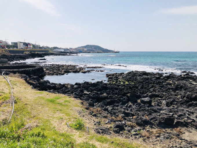 酒店出来就是海边,济州岛的海水颜色以深蓝为主,海水清澈,这里的海边都是黑色的熔岩,据说离我们酒店不远还有一个海水温泉。