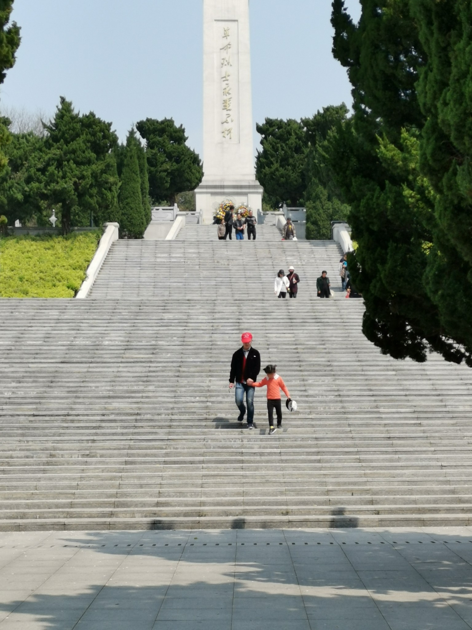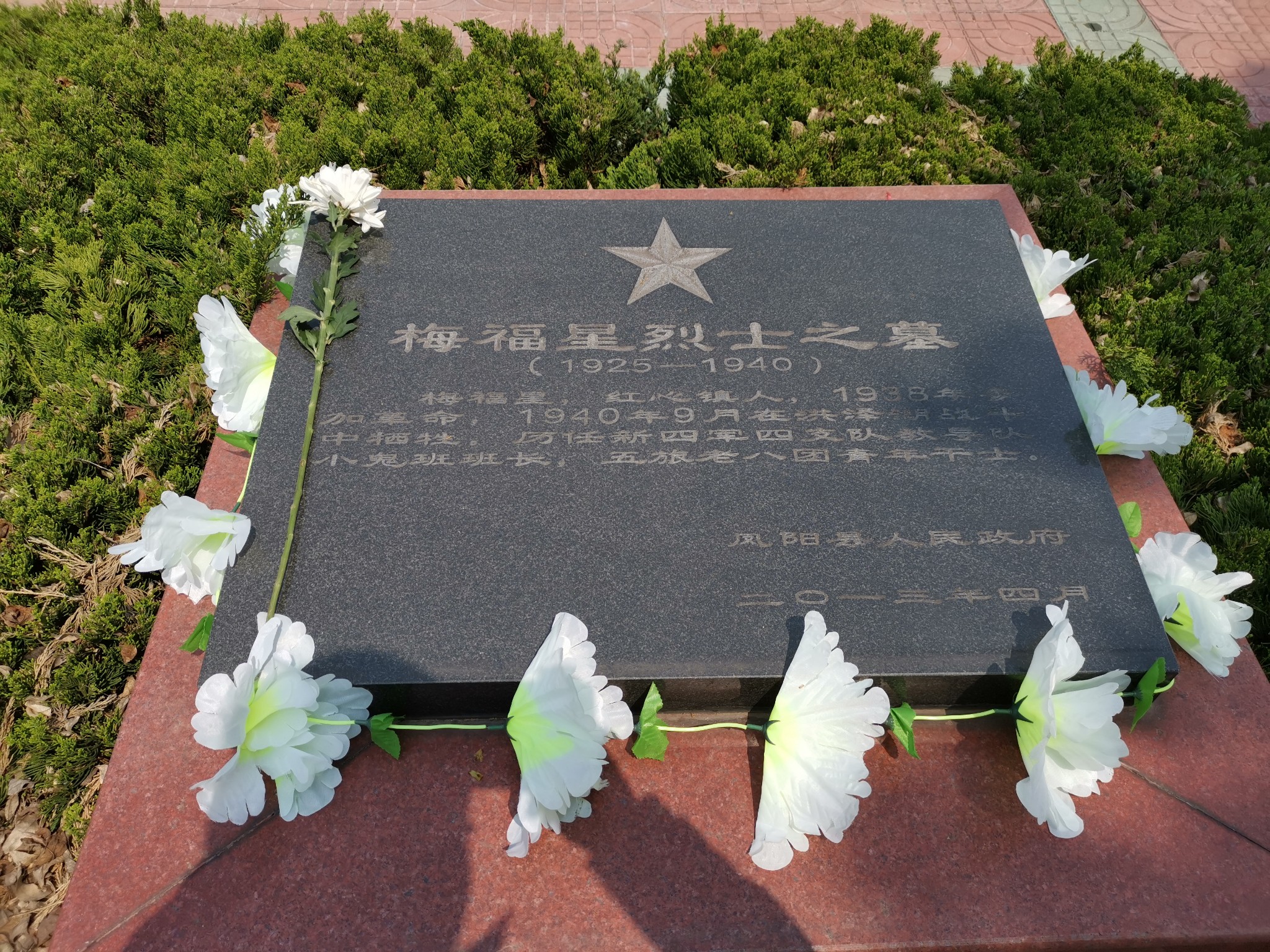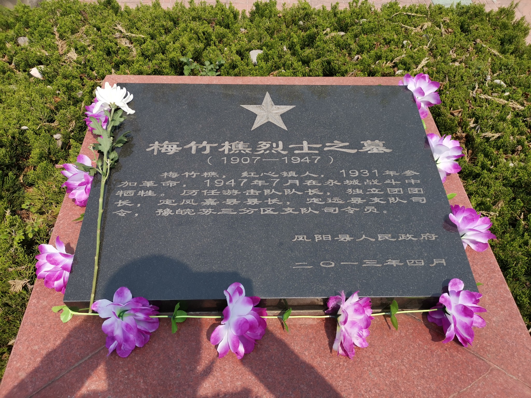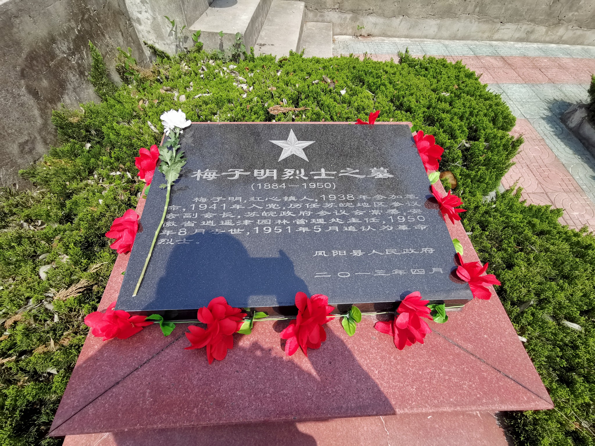 4月5日是清明节,凤阳烈士陵园中有我外高外公(外婆的祖父)梅子明、外曾外公(外婆的父亲)梅竹樵、大舅外公(外婆的大哥)梅福星的墓,到凤阳第一站就到那里扫墓,我也是第一次来,见我从没见过的三位先辈。陵园门口只有一位大妈在卖花,10元挑了三支白菊进烈士陵园。当天是中午,看门的门卫都不在,我想问墓在哪里都没人指路,好在我从当地人那里得知墓园不大,自己上山寻找。